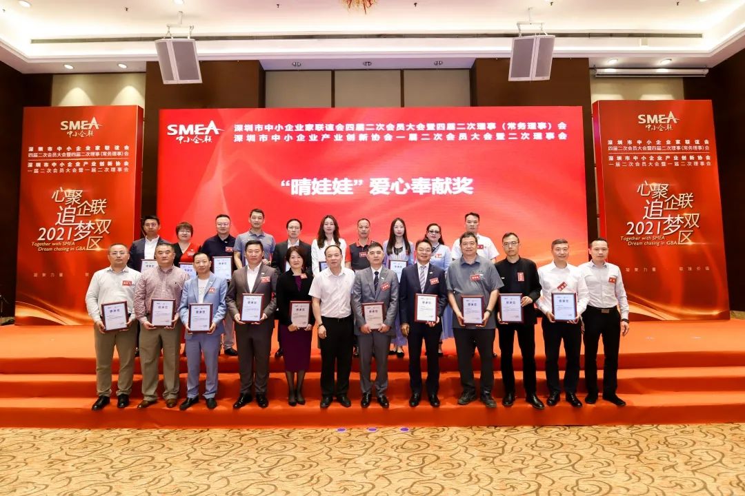 深圳市中小企業(yè)服務(wù)局副局長(zhǎng)陳小林(一排左六)為獲得感恩相伴獎(jiǎng)的企業(yè)家頒獎(jiǎng)