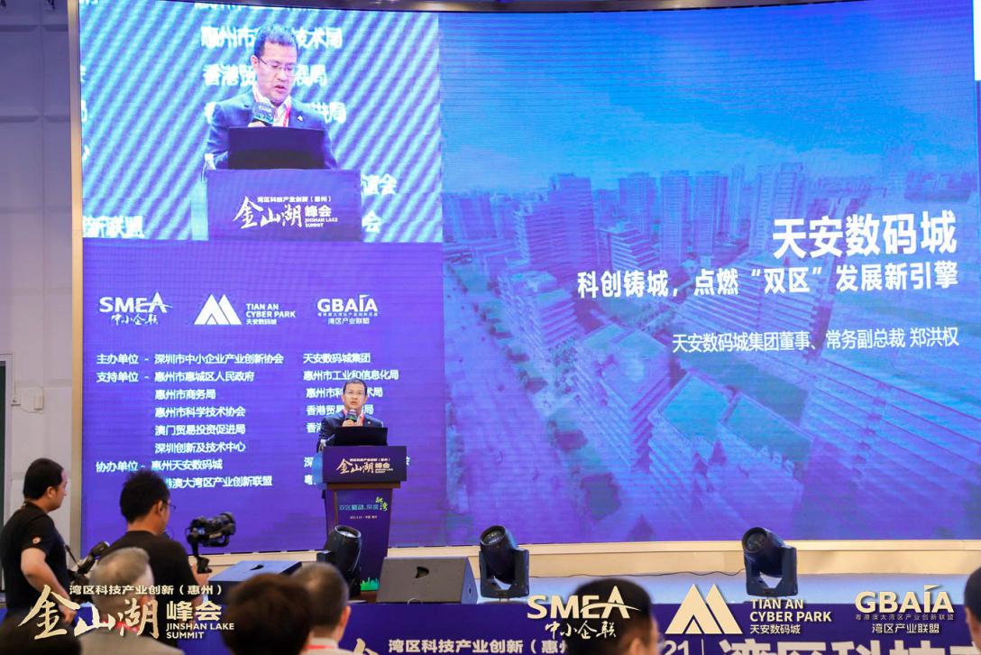 天安數(shù)碼城集團董事、常務副總裁鄭洪權以天安數(shù)碼城為引,引出了《天安數(shù)碼城——打造粵港澳大灣區(qū)科技創(chuàng)新引擎》的主題演講,在演講中他說“三十載,天安數(shù)碼城在經(jīng)濟大潮中始終保持旺盛的生命力,專注于企業(yè)服務精神和與時俱進的創(chuàng)新思維功不可沒,堅持以客戶為導向,以園區(qū)企業(yè)為中心,這也是天安數(shù)碼城保持的初心。對于惠州天安數(shù)碼城,我們是敢為民先,率先破局。惠州天安數(shù)碼城目標是科創(chuàng)產業(yè)的新地標,在雙區(qū)建設深度融灣的大背景下,惠州作為粵港澳大灣區(qū)重要節(jié)點城市具有無可比擬的區(qū)域優(yōu)勢和強勁的后發(fā)動力,在深圳都市圈發(fā)揮著重要作用?;葜萏彀矓?shù)碼城作為集團在全國范圍內布局的第14座城市、23座園區(qū),被認為是廣東省的重大項目,作為惠州產業(yè)的先行區(qū),我們將在金山湖畔主動搶抓雙區(qū)建設的重大歷史機遇,緊密結合區(qū)位、交通、景觀四大要素優(yōu)勢,努力打造科學、科技、科普、科創(chuàng)、科研、科教為主題的科創(chuàng)公園,真正建設為粵港澳大灣區(qū)產成人融合的高度結合新地標?!?/p>
