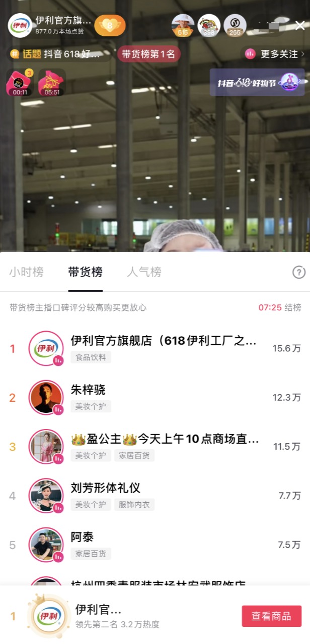 同時,伊利洞察到消費者對產(chǎn)品品質(zhì)的關(guān)注,和直播間消費者一起深入伊利工廠,直接在好奶的源頭開啟溯源直播,極大地滿足了消費者所見即所得的需求,同時也提升了直播的可看性,充分契合了興趣電商的內(nèi)核。這種新穎的直播模式最終創(chuàng)造了連續(xù)霸屏帶貨小時榜5小時的自播紀錄,在618當天實現(xiàn)了抖音行業(yè)單日自播榜第一,單日銷售額破千萬的傲人成績。