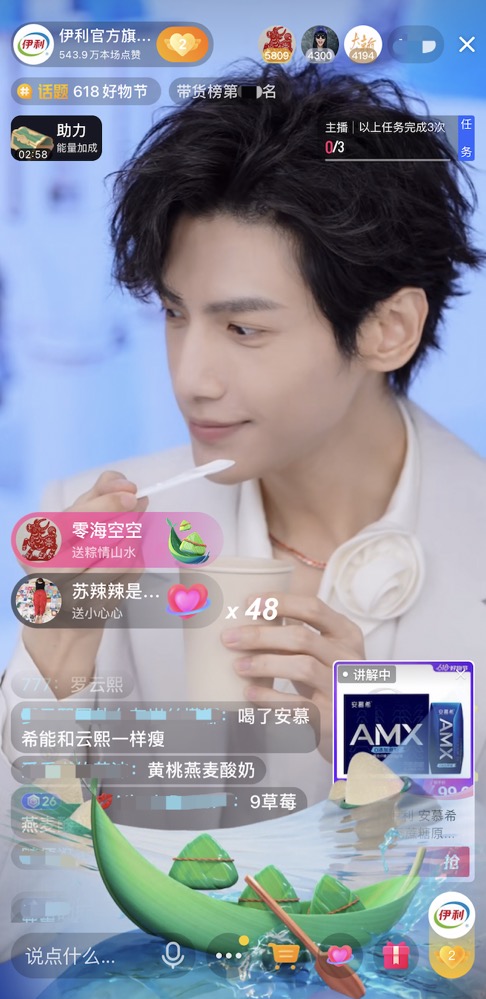 在新營銷上,伊利旗下安慕希品牌憑借強大的品牌力,在618期間聯(lián)合平臺打造首個乳品品牌狂歡日。邀請品牌形象大使羅云熙空降伊利抖音直播間,與消費者進行互動直播,內(nèi)容寵粉的同時高效轉(zhuǎn)化銷售。憑借寵粉互動吸引抖音平臺年輕消費者群體,狂歡日當日直播間消費者中,年輕人群比例高達70%。
