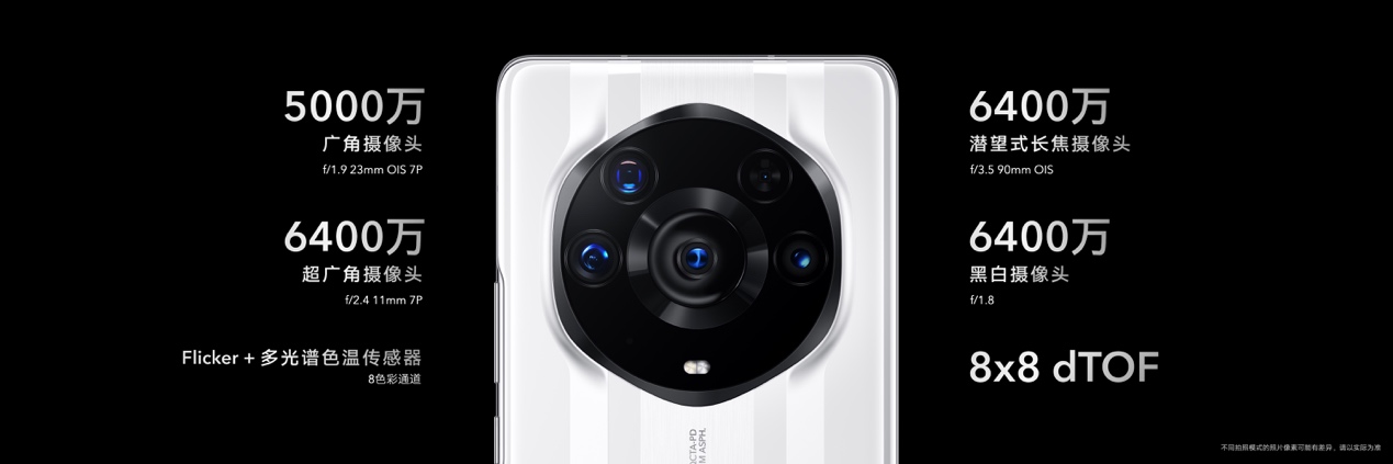 影像方面,榮耀Magic3至臻版打破手機(jī)鏡頭天花板,突破性地采用了多主攝設(shè)計(jì)。在與榮耀 Magic3 Pro采用同樣的業(yè)界領(lǐng)先6400萬(wàn)潛望式長(zhǎng)焦鏡頭和6400萬(wàn)黑白鏡頭基礎(chǔ)上,榮耀 Magic3至臻版將5000萬(wàn)像素超大底主攝升級(jí)為索尼 IMX700,傳感器尺寸達(dá)到1/1.28英寸,擁有業(yè)界領(lǐng)先的感光度(ISO),成像解析力、暗光拍攝能力更強(qiáng)。而超廣角微距鏡頭,也從1300萬(wàn)像素,升級(jí)為業(yè)界領(lǐng)先的6400萬(wàn)像素126°超大廣角微距鏡頭,能完美呈現(xiàn)廣闊空間中整個(gè)建筑、地標(biāo),亦能捕捉2.5cm近距離下的微小細(xì)節(jié),提供肉眼無(wú)法看到的創(chuàng)意視角。多主攝計(jì)算攝影,實(shí)現(xiàn)多焦段高清影像。