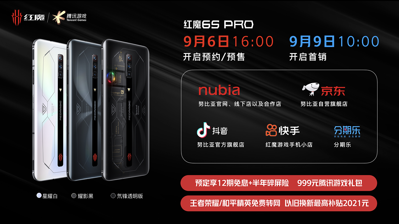紅魔6S Pro目前已在努比亞官網(wǎng),努比亞京東自營(yíng)旗艦店開啟預(yù)售,9月9日上午10點(diǎn)全國(guó)線上線下渠道同步開售!現(xiàn)在預(yù)定享12期免息并贈(zèng)送半年碎屏險(xiǎn),購(gòu)機(jī)尊享價(jià)值999元的騰訊游戲禮包、王者榮耀/和平精英免費(fèi)轉(zhuǎn)網(wǎng)資格,以舊換新最高補(bǔ)貼2021元。