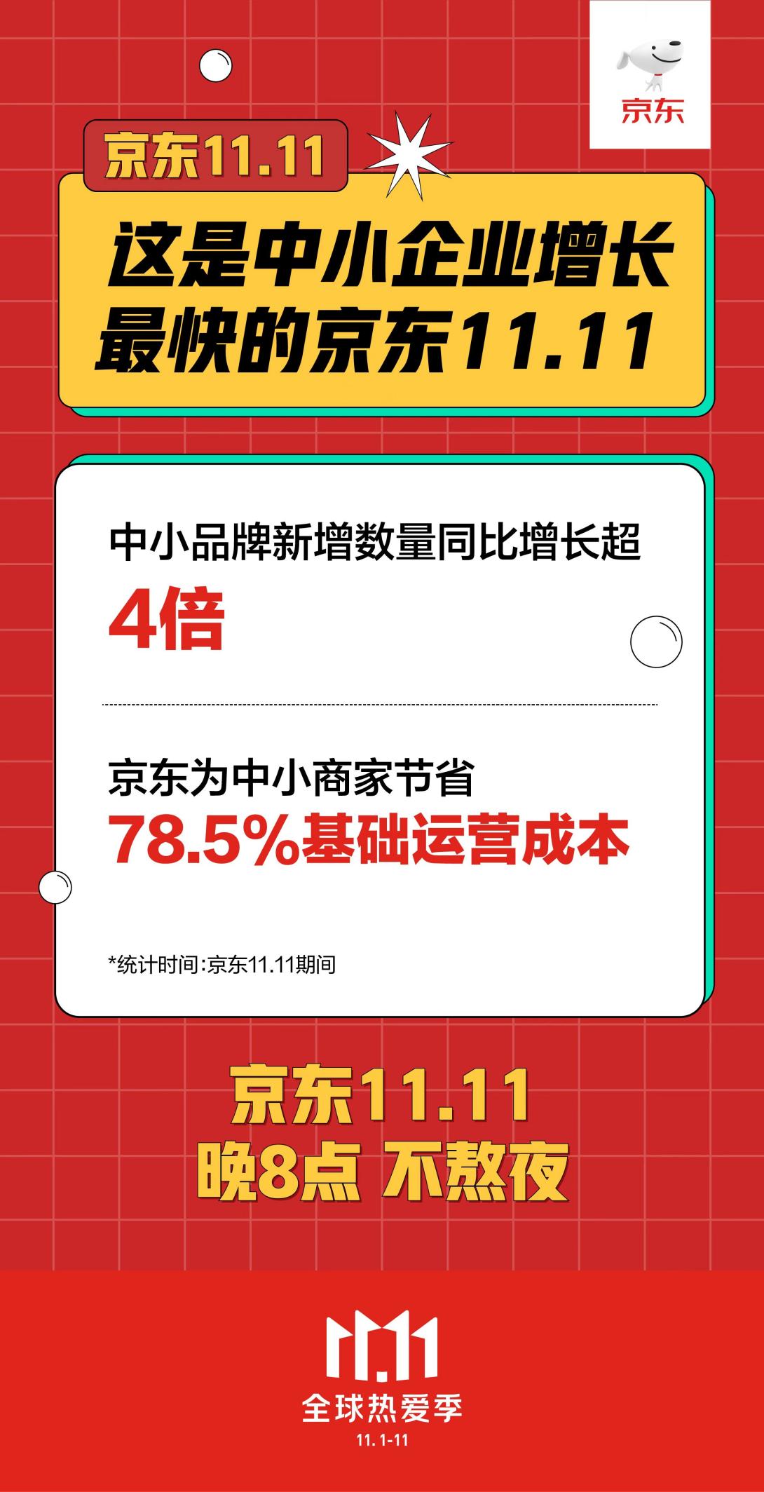 這是中小企業(yè)成長最快的京東11.11,中小品牌新增數(shù)量同比增長超4倍,京東為中小商家節(jié)省78.5%的基礎(chǔ)運(yùn)營成本。以氣彈茶飲料為主打的“果子熟了”品牌為例,參與京東小魔方新品日的1小時(shí)內(nèi),成交額便同比提升500%,訪客數(shù)環(huán)比提升500倍。