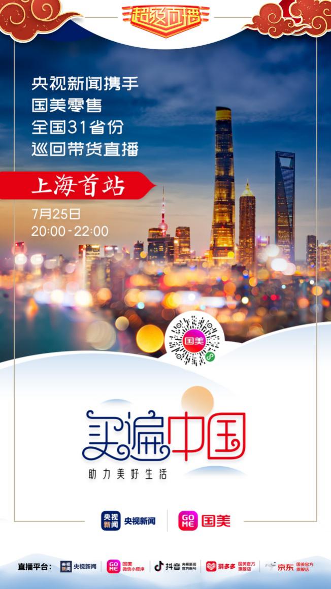 7月25日晚8點(diǎn),“買遍中國(guó)·助力美好生活——央視新聞&國(guó)美零售全國(guó)31省份巡回帶貨直播”首場(chǎng)將在上海復(fù)星藝術(shù)中心正式啟動(dòng),這也是國(guó)美首次將超級(jí)直播搬到戶外來(lái)舉辦。
