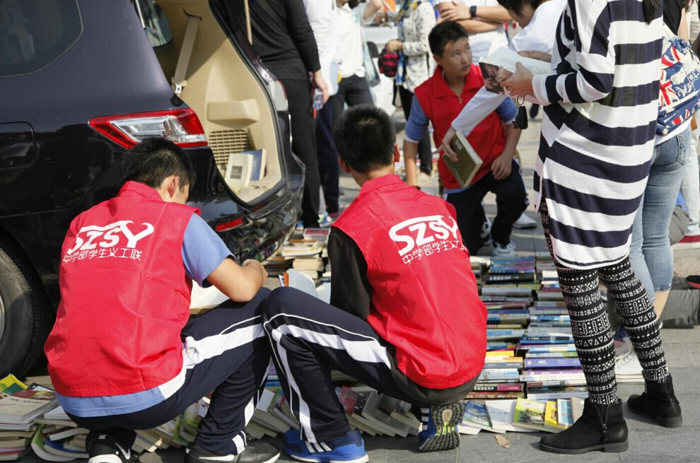 深圳市實(shí)驗(yàn)中學(xué)的車尾箱展位前圍滿了前來換書的人