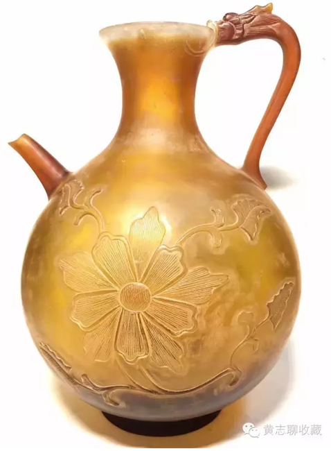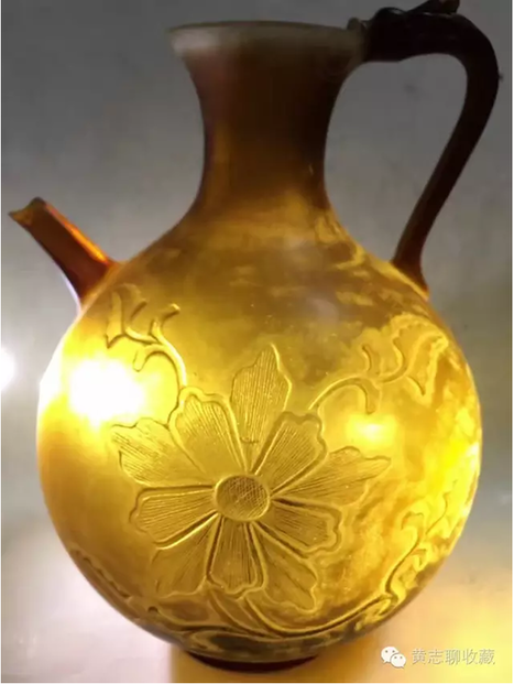 琉璃在唐代極為名貴。這從史書記載可窺一二。房玄齡的《晉書》中有關(guān)于琉璃器的記載“(王濟(jì))性豪侈,麗服玉食……帝嘗幸其宅,供饌甚豐,悉貯琉璃器中?!蓖鯘?jì)在招待皇帝時(shí)用了成套的琉璃碗盤,以逞其豪富,可見當(dāng)時(shí)琉璃器之貴重或要超過金、銀等器。又如宋代司馬光主編的《資治通鑒》中記載了這樣一段歷史事實(shí):嶺南節(jié)度使路嗣恭在平息叛亂中趁機(jī)劫掠商民,得到了大批財(cái)物。他把其中一個(gè)直徑九寸的琉璃盤獻(xiàn)給了唐代宗。唐代宗非常高興,“以為至寶”。法門寺地宮出土的唐代琉璃器大多為皇家捐贈的禮佛之物也可佐證其珍貴。 這件執(zhí)壺為琉璃材質(zhì),高20cm、腹徑14.5cm,色澤黃褐,半透明,晶瑩潤澤,光澤柔和。小口,束頸,腹部圓鼓,餅足;前有直流,后為龍柄。整體形制穩(wěn)重大方,圓潤飽滿,具有典型的唐代特征。壺身兩面刻有菊紋,線條流暢自然,勁健有力。整體透入出唐人的灑脫自信。這類唐代的琉璃作品存世極少,目前為數(shù)不多的一些作品大多出自窖藏、地宮及貴族墓葬,屬于珍稀文物。此件執(zhí)壺保存完整,尤為難得。 欣賞更多藏品,歡迎瀏覽【黃志博物館】網(wǎng)站:www.huangzhimuseum.com?