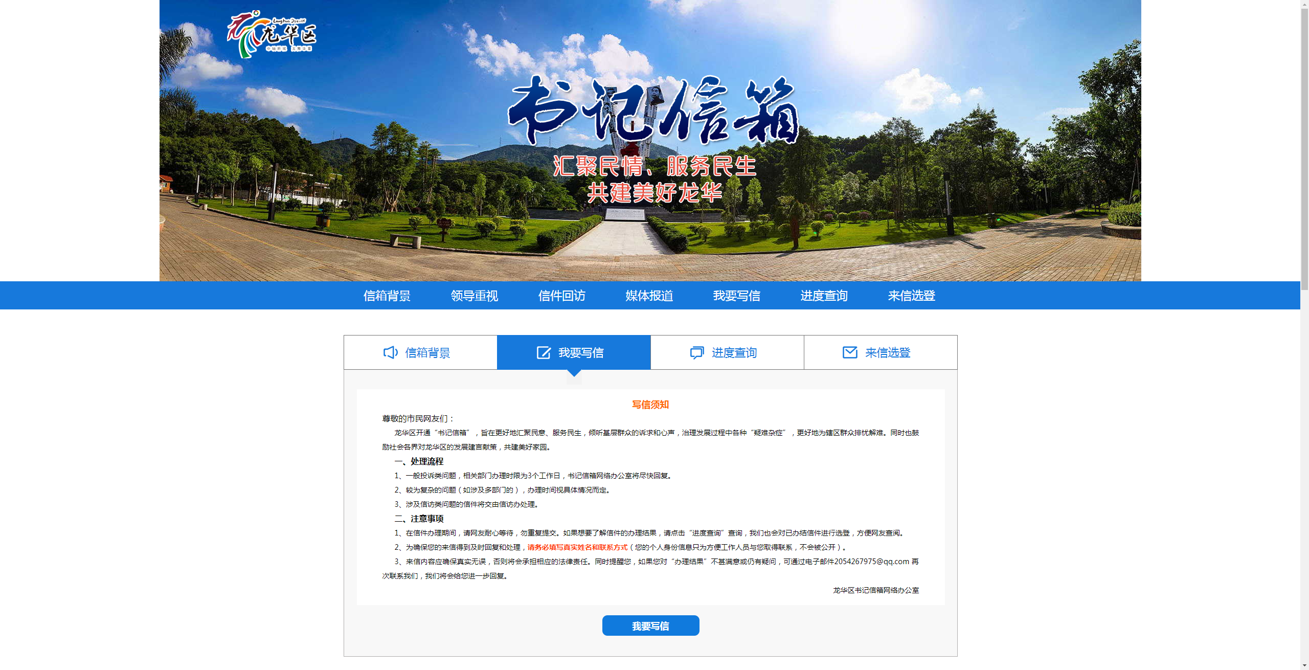 龍華區(qū)“書記信箱”網(wǎng)絡(luò)平臺是由龍華區(qū)領(lǐng)導的指導下搭建的網(wǎng)絡(luò)信息平臺,由深圳新聞網(wǎng)團隊進行開發(fā)搭建?!皶浶畔洹钡臉?gòu)建,是龍華區(qū)委貫徹落實黨的群眾路線,踐行“三嚴三實”的一項新舉措。“書記信箱”自2015年10月31日正式上線以來,逐步成為龍華市民向龍華區(qū)委反映、提出建議、意見和投訴請求的重要渠道。