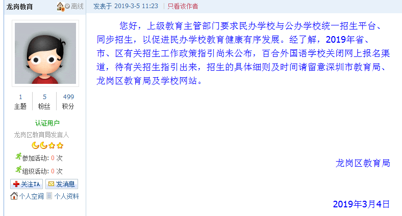 3月3日,有網友“清熱解毒”在深圳論壇以《不到24小時,百合外國語學校網上報名,為何突然關閉...》為題發(fā)帖反映,“3月1日(周五)深圳眾多小學6年級家長都收到了通知,百合外國語學校的信息填報時間為3月2日到3月5日?!啊捌届o的周末被百外半夜的一則公告打亂了,家長們更是被突如其來的新生登記急蒙了”。
