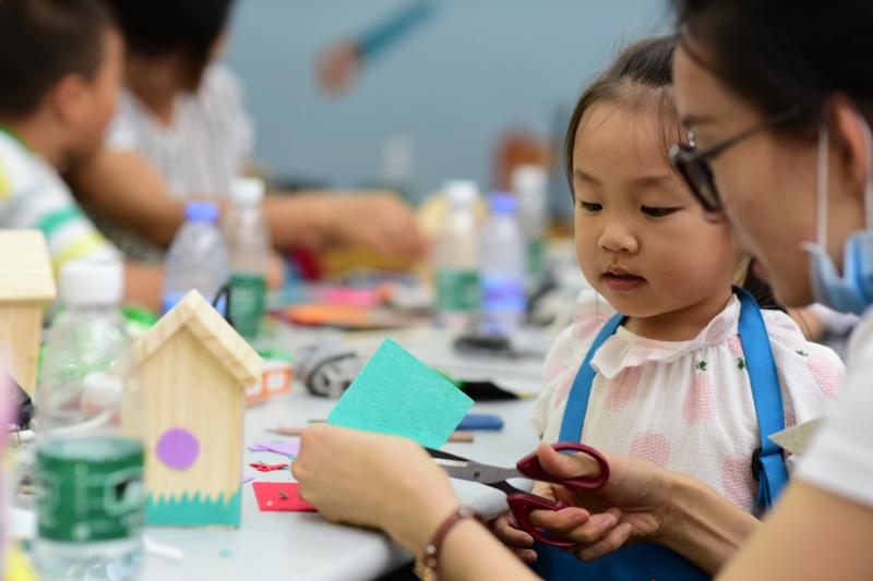 “小朋友們,像我一樣,找到這兩個結(jié)構(gòu)部件,然后將他們拼接在一起……”現(xiàn)場,老師一邊為小朋友們講解著手工音樂盒的搭建步驟,一邊現(xiàn)場為孩子們示范制作過程。坐在四周的“小小木匠”們一個個伸長了脖子,或站或坐,看著老師演示,一字不落的將老師的講解銘記在心。“老爸,鋸子原來要以這樣的角度去鋸才更省力呀?!币晃粍倓傮w驗過木工工具的小朋友滿臉興奮的跟自己的父親說道。
