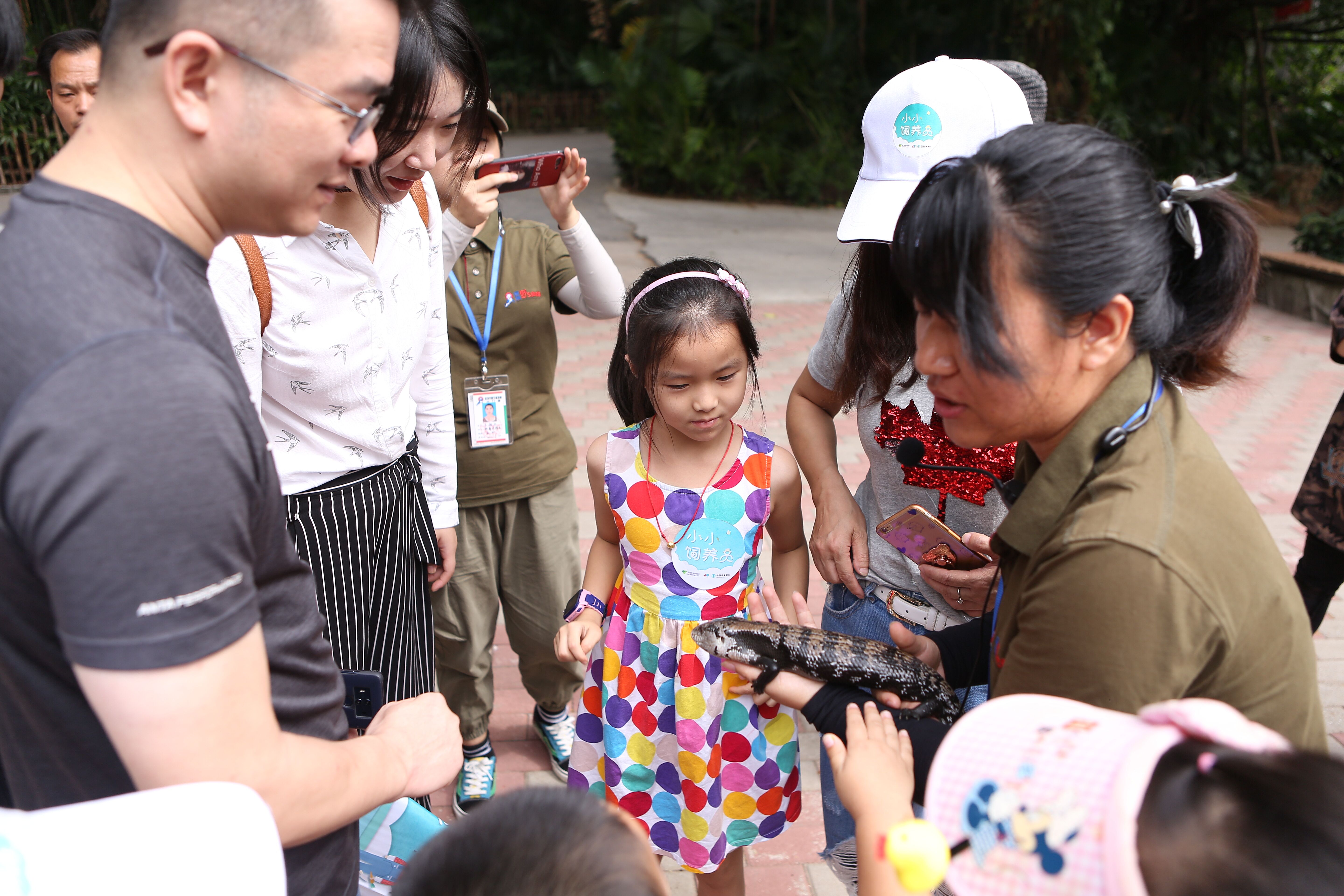 “鬃獅蜥和藍(lán)舌石龍子都是蜥蜴的一種。當(dāng)遭受威脅時(shí),鬃獅蜥會(huì)張開嘴及將帶刺的咽喉膨起來(lái)像一頭生氣的獅子。藍(lán)舌石龍子的舌頭是藍(lán)色的,平時(shí)會(huì)不時(shí)向外一伸一伸?!毙∨笥褌冋J(rèn)真地聽科普導(dǎo)游講解兩種蜥蜴的區(qū)別,膽大的孩子則抱起蜥蜴仔細(xì)觀察起來(lái)。