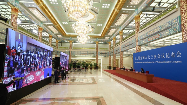 2020年5月28日(星期四)下午十三屆全國人大三次會議閉幕后,國務(wù)院總理李克強在人民大會堂三樓金色大廳出席記者會并回答中外記者提問。為有效防控疫情,共同維護公共衛(wèi)生與健康,記者會采用網(wǎng)絡(luò)視頻形式進行。新華網(wǎng)、中國政府網(wǎng)進行現(xiàn)場直播。 [2020-05-2814:00 ]