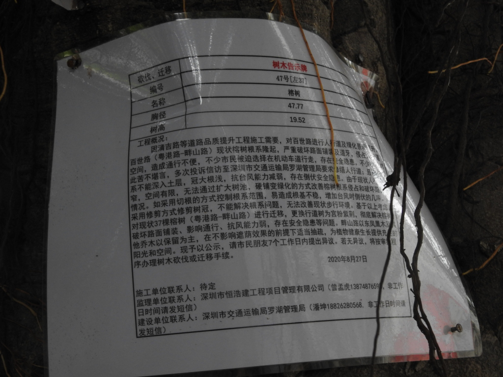 9月6日,有網(wǎng)民在深圳論壇發(fā)帖《深圳版的指鹿為馬,蓮塘為了砍樹,不是榕樹硬說是榕樹》反映,稱“百世路邊大樹貼上一張張紙條,大意是這些榕樹根系發(fā)達(dá),破壞人行道、路牙和機(jī)動車路面,為了精準(zhǔn)提升,所以要移除砍掉!仔細(xì)看看,這些行道樹根本就不是榕樹,而且沒有損壞道路路面,至于路邊的人行道,是這兩年才修建有的,之前屬于路邊綠化帶,種花草。”十多年來沒有一棵樹被臺風(fēng)吹倒!該網(wǎng)友稱影響該路段市民出行另有原因,“至于市民被迫在機(jī)動車道上行走,那是道路的兩邊停滿了機(jī)動車,很多都是僵尸車,沒人管。”