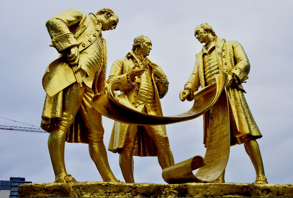 伯明翰是工業(yè)革命的發(fā)源地,市區(qū)會展中心對面有一座代表城市形象的雕塑作品,三個鎦金人物的塑像并肩佇立,正在討論問題,其金燦燦外表十分搶眼。這三個塑像是英國工業(yè)革命時期的杰出人物,蒸汽機的發(fā)明和制造者瓦特,蒸汽機和煤氣街燈的發(fā)明者默克多,工業(yè)家和機械制造商馬修·博爾頓。李仁奇 攝