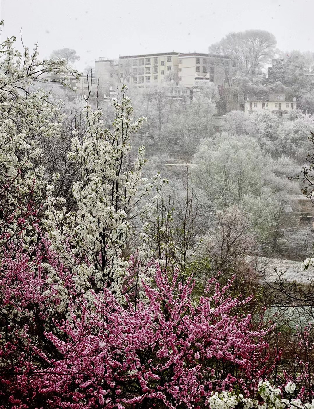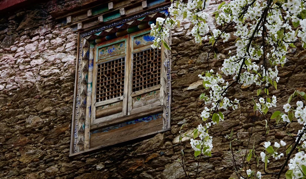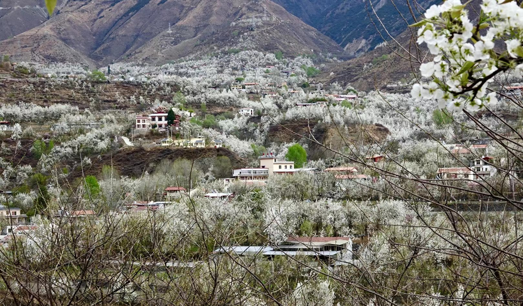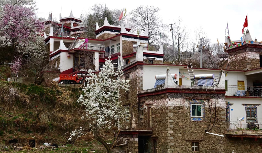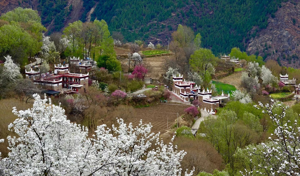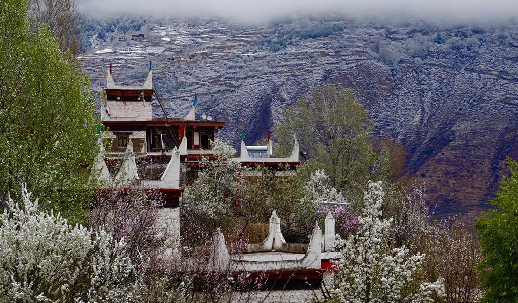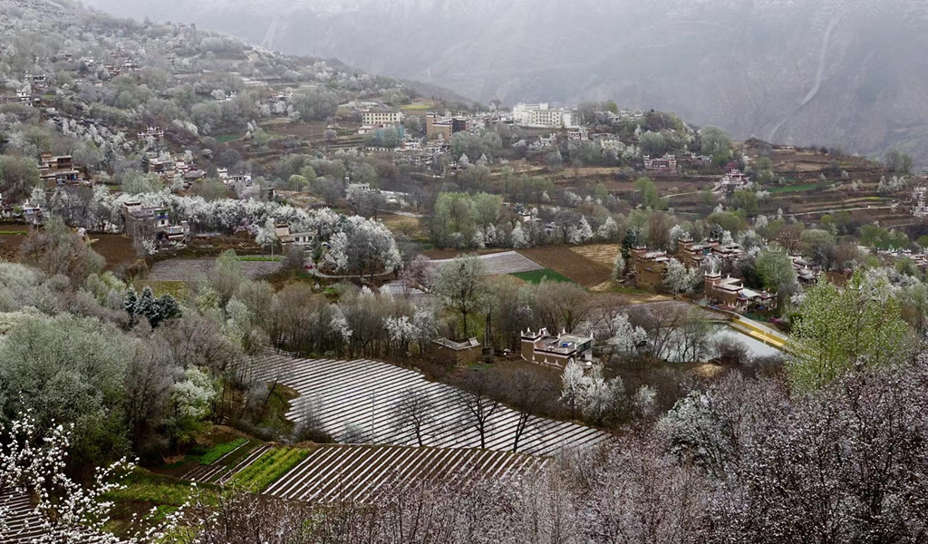 藏式民居與雪花梨花桃花相互掩映,美若仙境。李仁奇 攝