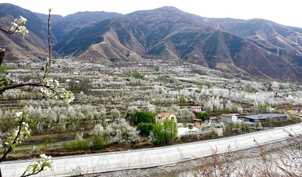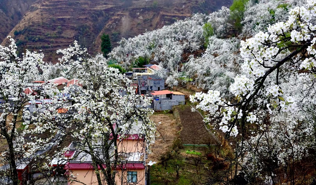 每年三到四月,金川縣的上百萬(wàn)株梨樹(shù)在春日照耀下盛開(kāi)白花,萬(wàn)畝梨海、百里吐蕊。李仁奇 攝
