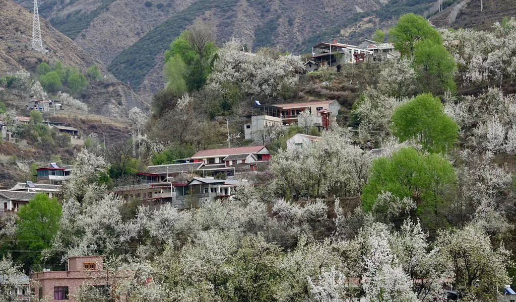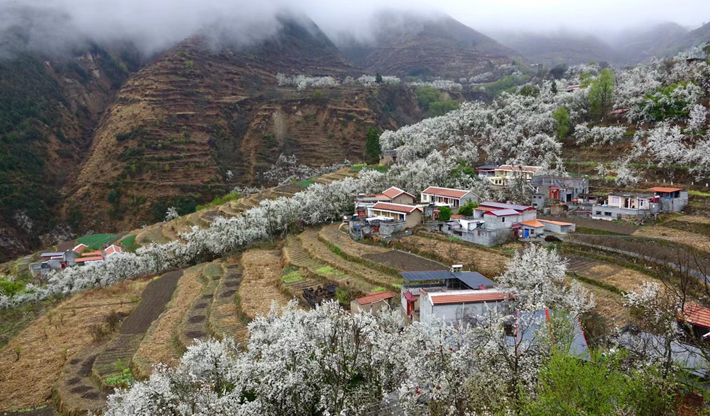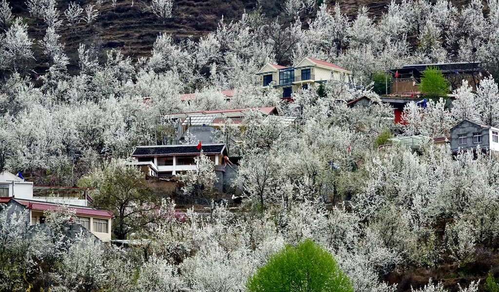 梨花叢中的村寨。李仁奇 攝