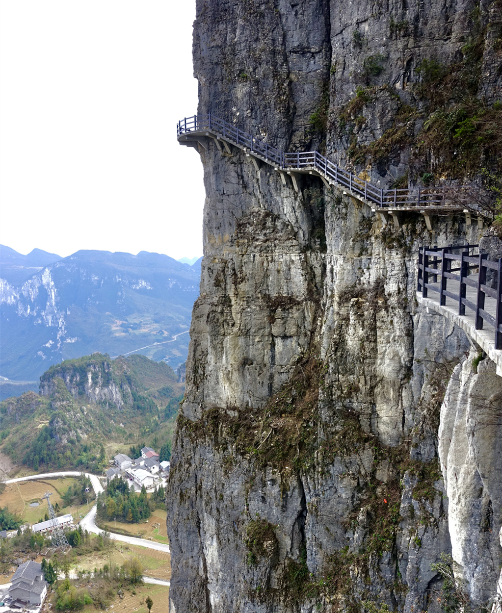 棧道橫掛在海拔約1700米、凈高約300米的絕壁間,往下看異常驚險(xiǎn),往上看則嘆為觀止。李仁奇 攝