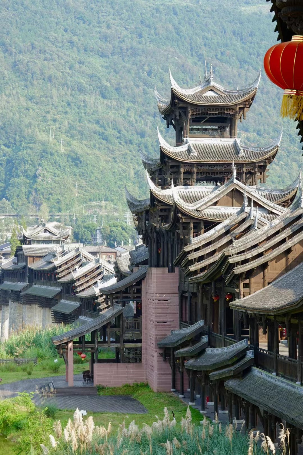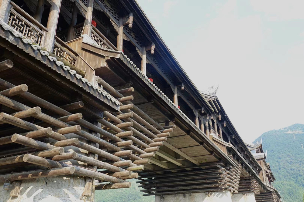 濯水廊橋長658米、寬5米,分為橋、塔、亭三部分,橋身為純木結構,建筑材料之間以榫頭卯眼互相穿插銜接,直套斜穿,牢固精密。李仁奇 攝