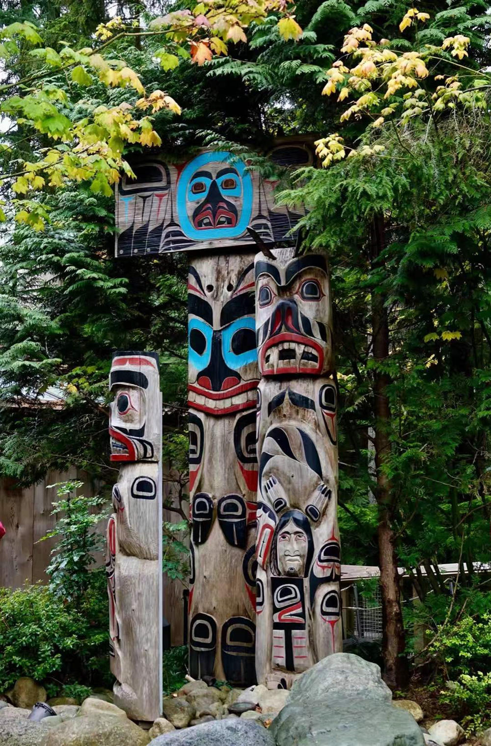 圖騰柱上面刻有帶著不同象征意義圖案,多數是鷹、熊、人之類的圖騰疊加,每根圖騰柱代表不同的意義,透著一種古樸和粗獷的美。李仁奇 攝