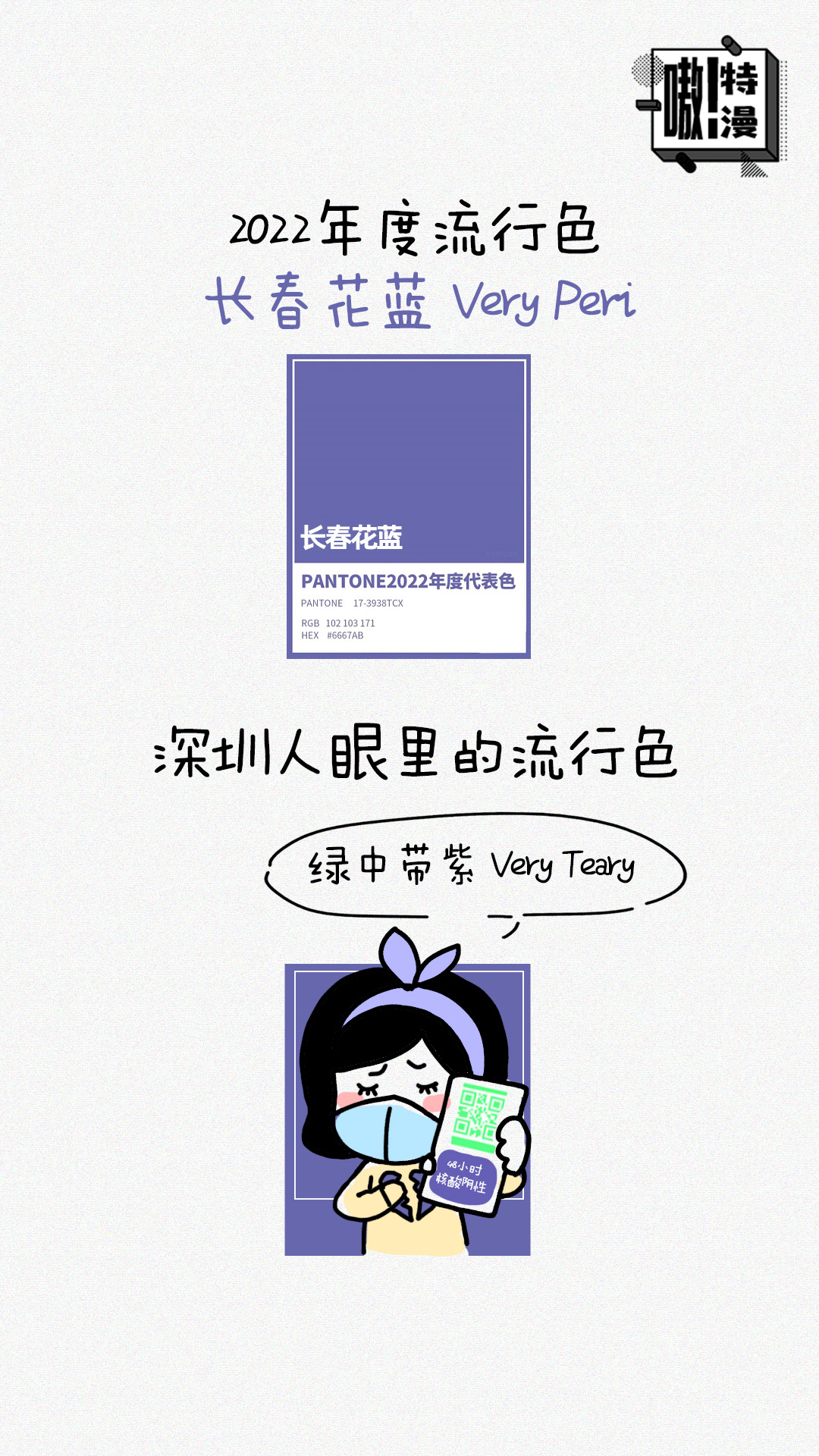 #嗷!特漫# 【#深圳人眼里的流行色是綠中帶紫# 】潘通(一家專門開發(fā)和研究色彩的權(quán)威機(jī)構(gòu))發(fā)布的2022年度流行色是名為very peri的長春花藍(lán)。而深圳人眼里的流行色則是綠中帶紫 Very Teary