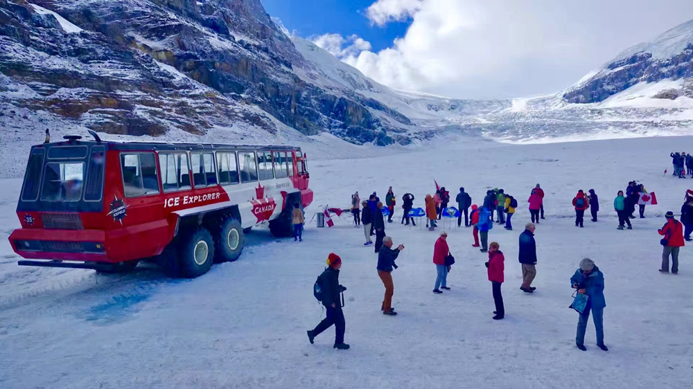哥倫比亞冰原是北美洲最容易進入的冰川群。乘坐特別設(shè)計的“冰原探險家號”全地形旅游巴士,可以輕松踏上長達六千米的阿薩巴斯卡冰河上的冰原。李仁奇 攝