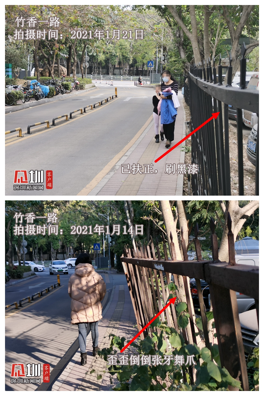 記者在竹香一路看到,原本向外傾斜的圍欄已經(jīng)全部扶正加固,且重新噴上黑色新漆,看起來(lái)整齊了許多,通行體驗(yàn)較之前更好。“現(xiàn)在弄得不錯(cuò),比之前牢固很多,向外的尖尖也都弄整齊了”家住附近的王先生說(shuō)。