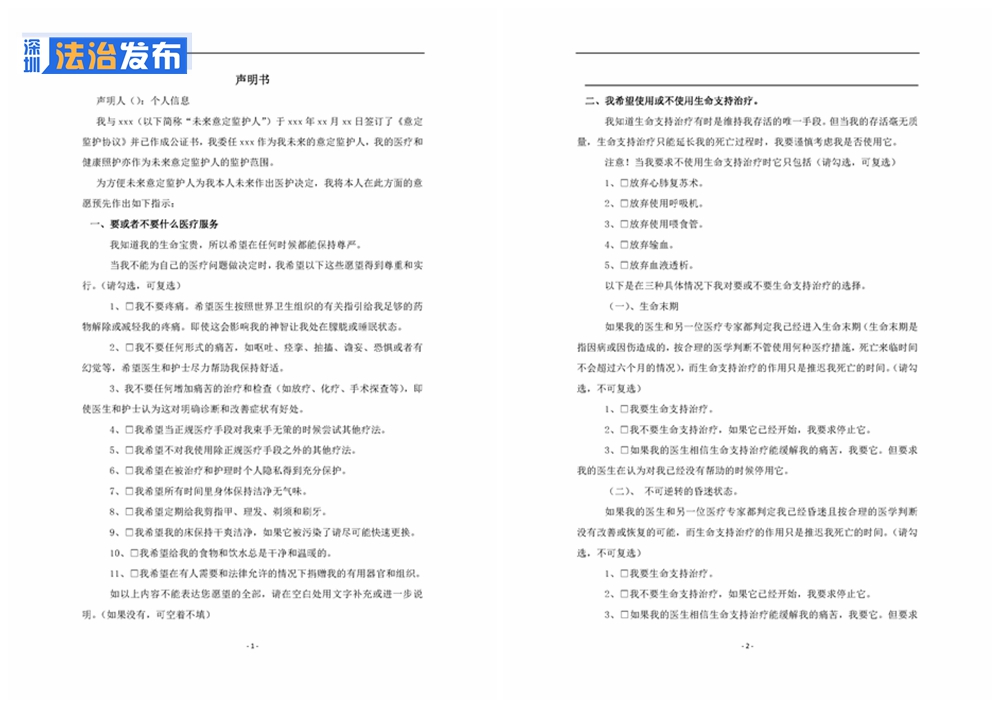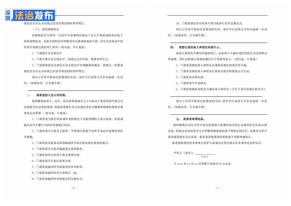 除了生前預(yù)囑的3種情況外,杜芹律師公證的這份聲明書,包含5個(gè)愿望清單①我要或不要什么醫(yī)療服務(wù)②我希望使用或者不使用生命支持治療③我希望別人怎么對(duì)待我④我想讓我的家人和朋友知道什么⑤我希望誰(shuí)幫助我。