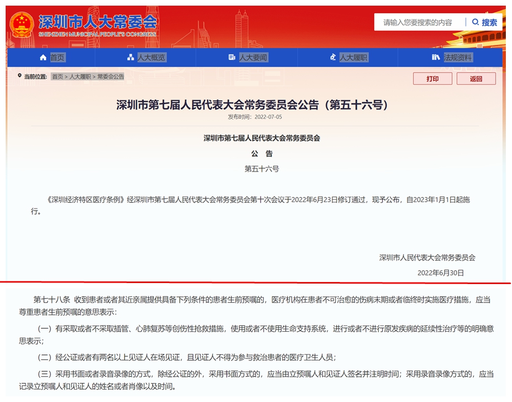 深圳市人大常委會(huì)官網(wǎng)頁(yè)面截圖及《深圳經(jīng)濟(jì)特區(qū)醫(yī)療條例》第七十八條內(nèi)容。