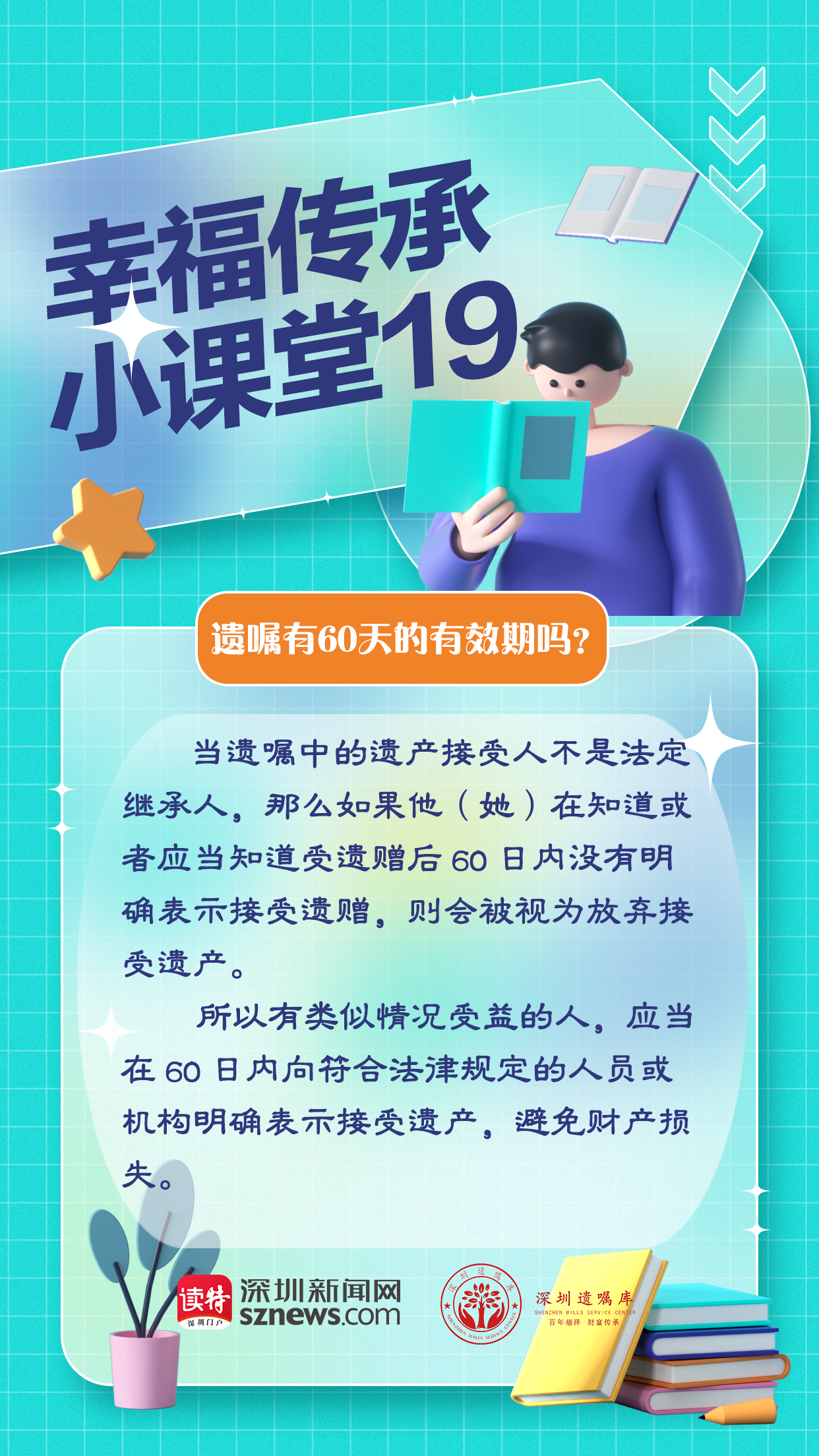 讀特客戶端·深圳新聞網(wǎng)2022年11月14日訊(記者 張玲 翁任瑩)遺囑是有有效期的,60天。當遺囑中的遺產(chǎn)接受人不是法定繼承人,那么在他(她)知道或者應(yīng)當知道受遺贈后60日內(nèi)沒有明確表示接受遺贈,則會被視為放棄接受遺產(chǎn)。