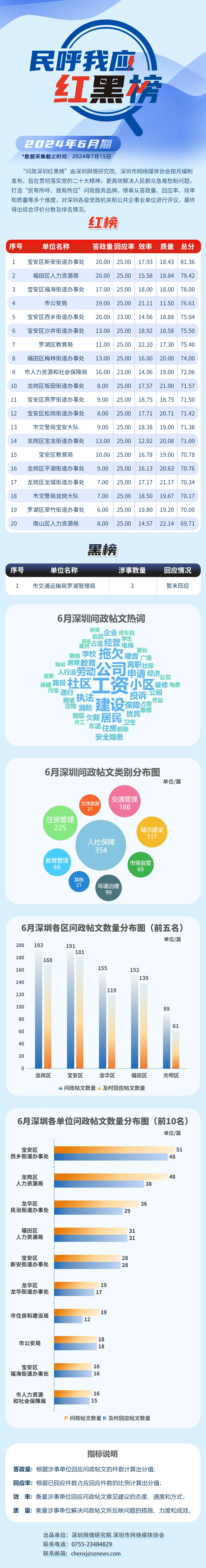“深圳民呼我應(yīng)紅黑榜”由深圳輿情研究院、深圳市網(wǎng)絡(luò)媒體協(xié)會(huì)按月編制發(fā)布,旨在貫徹落實(shí)黨的二十大精神,更高效解決人民群眾急難愁盼問(wèn)題,打造“民有所呼、我有所應(yīng)”問(wèn)政服務(wù)品牌。榜單從答政量、回應(yīng)率、效率和質(zhì)量等多個(gè)維度對(duì)深圳各級(jí)黨政機(jī)關(guān)和公共企事業(yè)單位進(jìn)行評(píng)議,最終得出綜合評(píng)價(jià)分?jǐn)?shù)及排名情況。