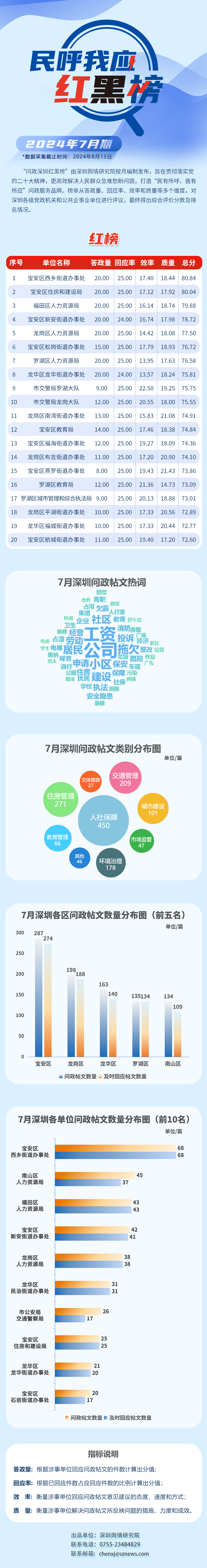 本期榜單采集的帖文主要來自深圳市及各區(qū)政府官網(wǎng)、深圳論壇、人民網(wǎng)領(lǐng)導(dǎo)留言板、深圳新聞網(wǎng)“民呼我應(yīng)”等平臺,所采集帖文發(fā)布時間為2024年7月1日至7月31日,采集截止時間為2024年8月15日。