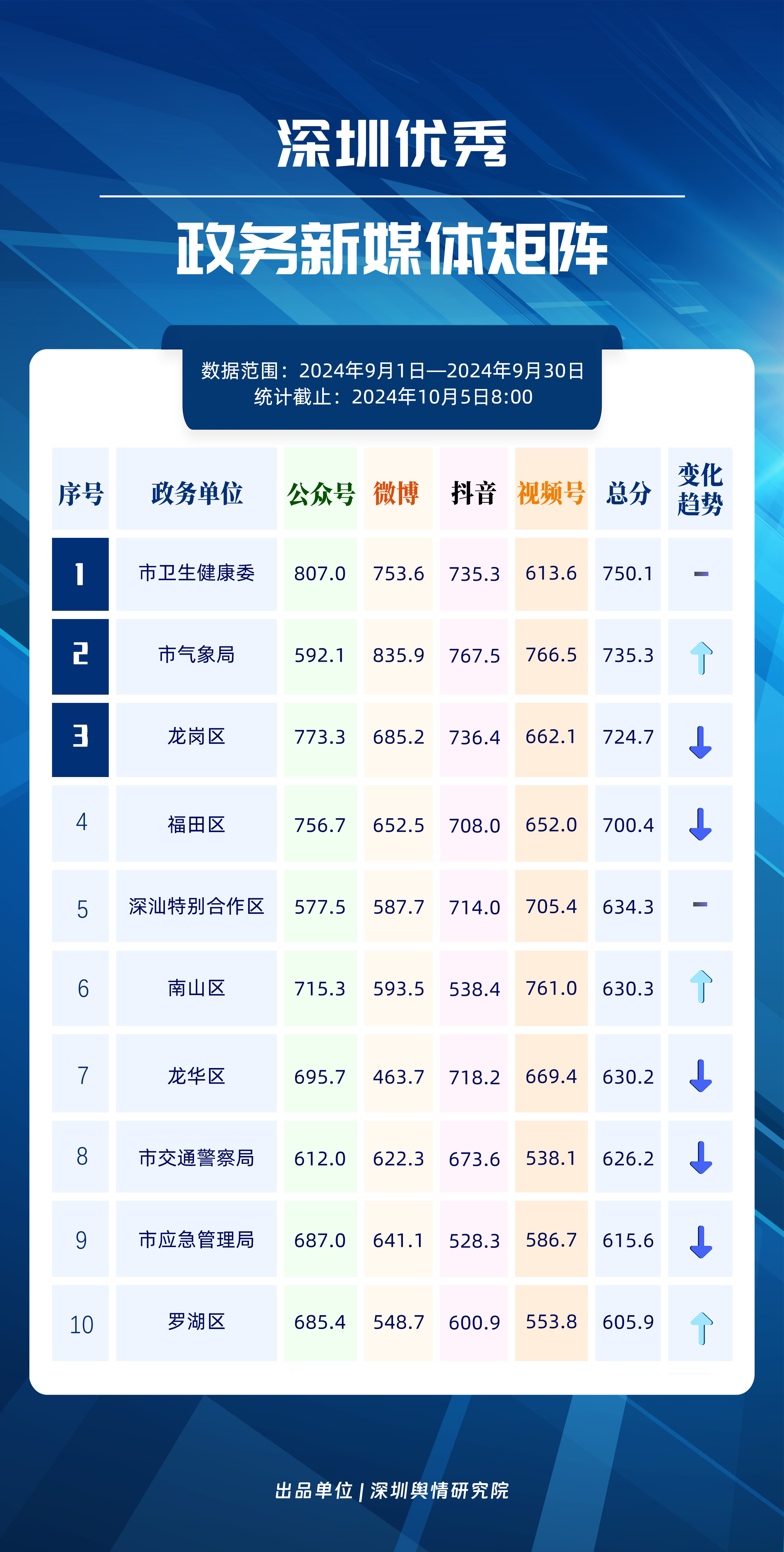本期迎來(lái)的是《深圳優(yōu)秀政務(wù)新媒體矩陣》2024年9月榜單,讓我們共同見(jiàn)證,哪些新媒體矩陣能夠憑借卓越的表現(xiàn)嶄露頭角,成為推動(dòng)政務(wù)傳播與服務(wù)創(chuàng)新的佼佼者。