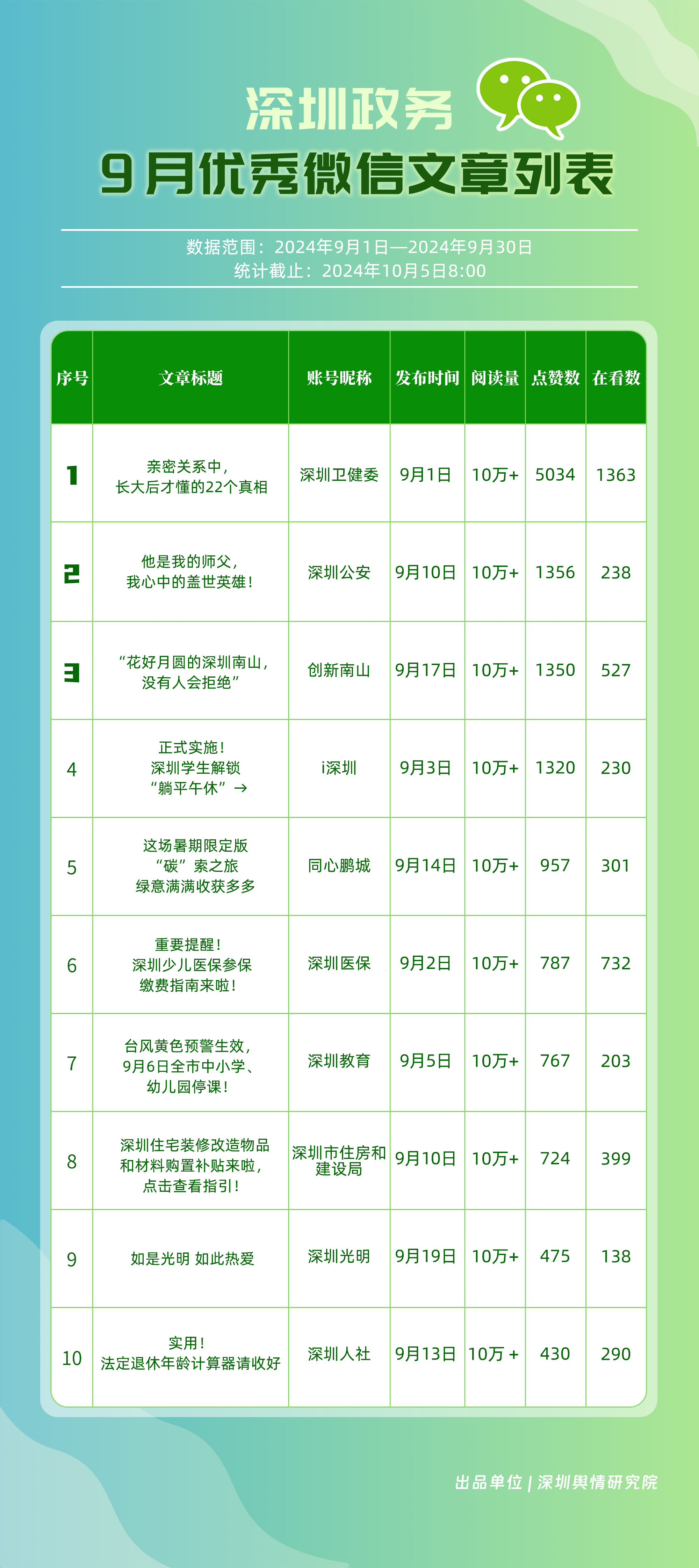 9月,“幸福福田”“深圳龍崗發(fā)布”“創(chuàng)新南山”“深圳龍華”“羅湖發(fā)布”“深圳光明”“青春深圳”“深圳衛(wèi)健委”“濱海寶安”和“深圳公安”共10個(gè)政務(wù)頭條號(hào)入選“優(yōu)秀政務(wù)頭條號(hào)”榜單。文章《剛剛!20多分鐘警報(bào)響徹深圳,不少人瞬間淚目……》涉及重大歷史節(jié)點(diǎn),引發(fā)市民深刻共鳴,《耳朵總是癢癢癢,是怎么回事?》《強(qiáng)冷空氣即將抵達(dá)廣東!國(guó)慶出游天氣……》等深入民生領(lǐng)域、緊貼節(jié)假日需求,提供了健康知識(shí)科普和氣象信息,以高度實(shí)用價(jià)值獲得網(wǎng)民點(diǎn)贊。