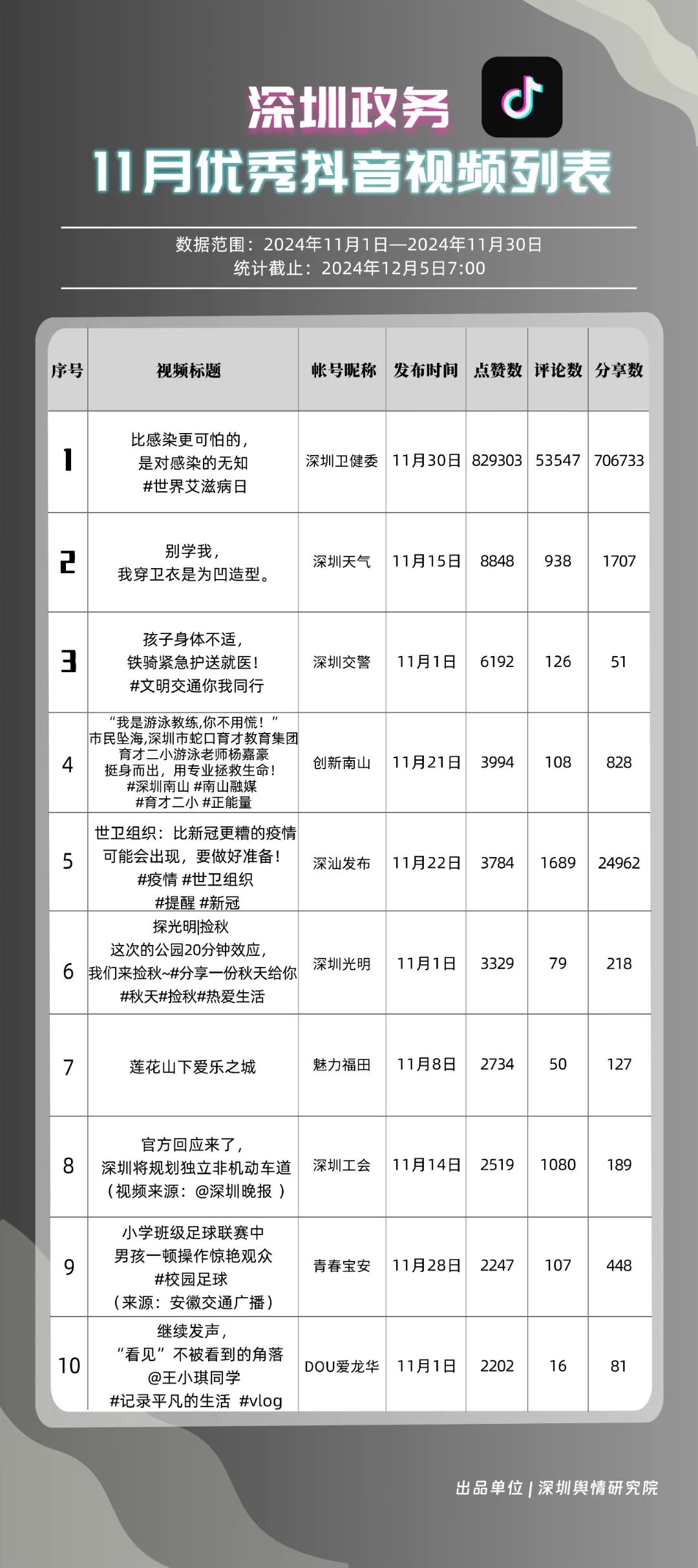 11月,“深圳衛(wèi)健委”“掌上龍崗”“深圳天氣”“深汕發(fā)布”“深圳工會(huì)”“深圳交警”“創(chuàng)新南山”“DOU愛龍華”“深圳光明”“中國前?!惫?0個(gè)政務(wù)抖音號(hào)獲得“深圳優(yōu)秀政務(wù)抖音號(hào)”稱號(hào)?!吧钲谛l(wèi)健委”憑借高質(zhì)量劇情內(nèi)容,巧妙融入健康知識(shí),視頻累計(jì)收獲近百萬點(diǎn)贊。同時(shí),“掌上龍崗”和“深圳天氣”也在視頻內(nèi)容創(chuàng)新上不斷探索,通過優(yōu)化宣傳策略和信息傳播方式,使得網(wǎng)民能夠在輕松愉快的氛圍中了解龍崗區(qū)的最新動(dòng)態(tài)和深圳的天氣信息,展現(xiàn)了政務(wù)抖音號(hào)的獨(dú)特魅力與社會(huì)影響力。