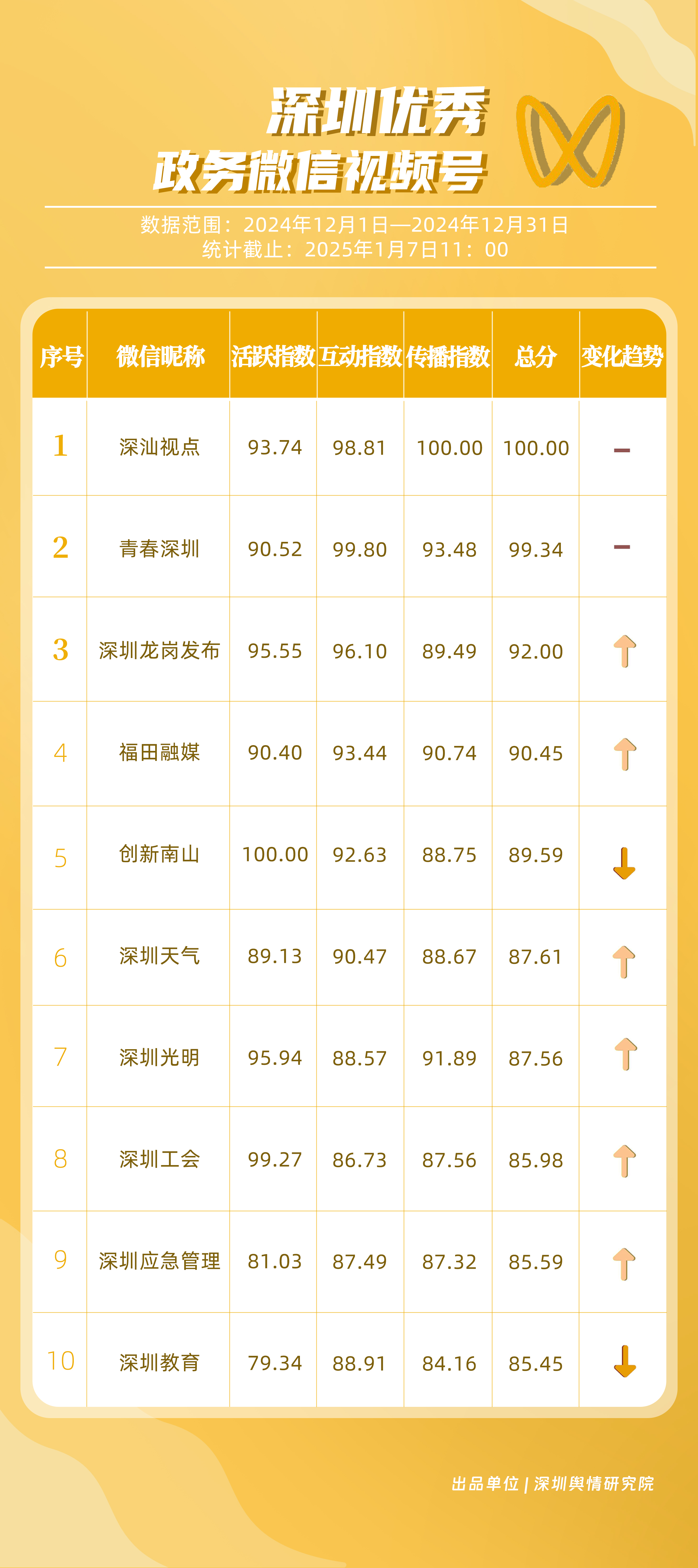 12月,獲“深圳優(yōu)秀政務(wù)微信視頻號(hào)”稱號(hào)的分別是“深汕視點(diǎn)”“青春深圳”“深圳龍崗發(fā)布”“福田融媒”“創(chuàng)新南山”“深圳天氣”“深圳光明”“深圳工會(huì)”“深圳應(yīng)急管理”“深圳教育”。其中,“深汕視點(diǎn)”“青春深圳”在互動(dòng)方面表現(xiàn)突出,占據(jù)榜單第一、第二位置。“深圳龍崗發(fā)布”活躍、互動(dòng)指數(shù)位于各政務(wù)視頻號(hào)前列,排名有所提升。“福田融媒”三大指標(biāo)得分均在90分以上,位于榜單第四名,充分展現(xiàn)各政務(wù)微信視頻號(hào)在信息更新、用戶互動(dòng)以及傳播范圍等方面的卓越能力和持續(xù)進(jìn)步。