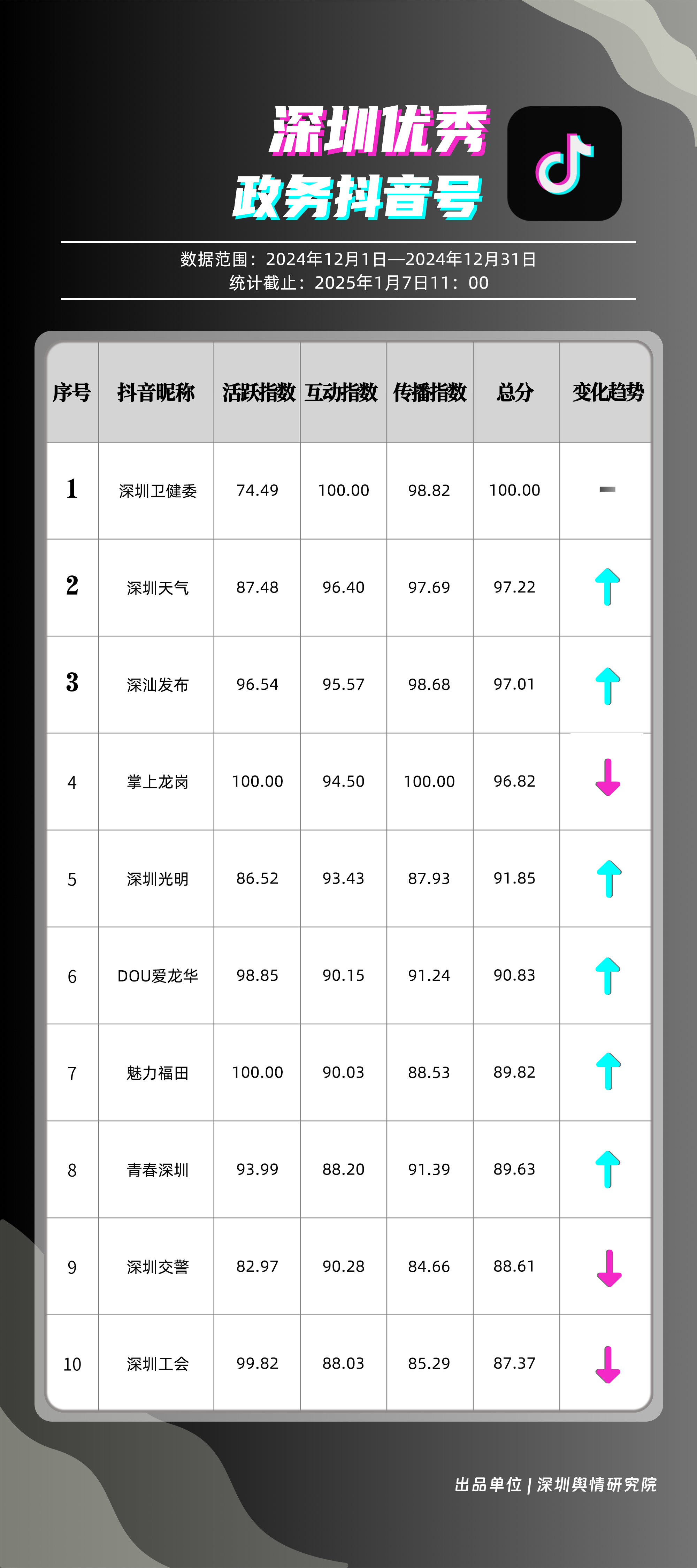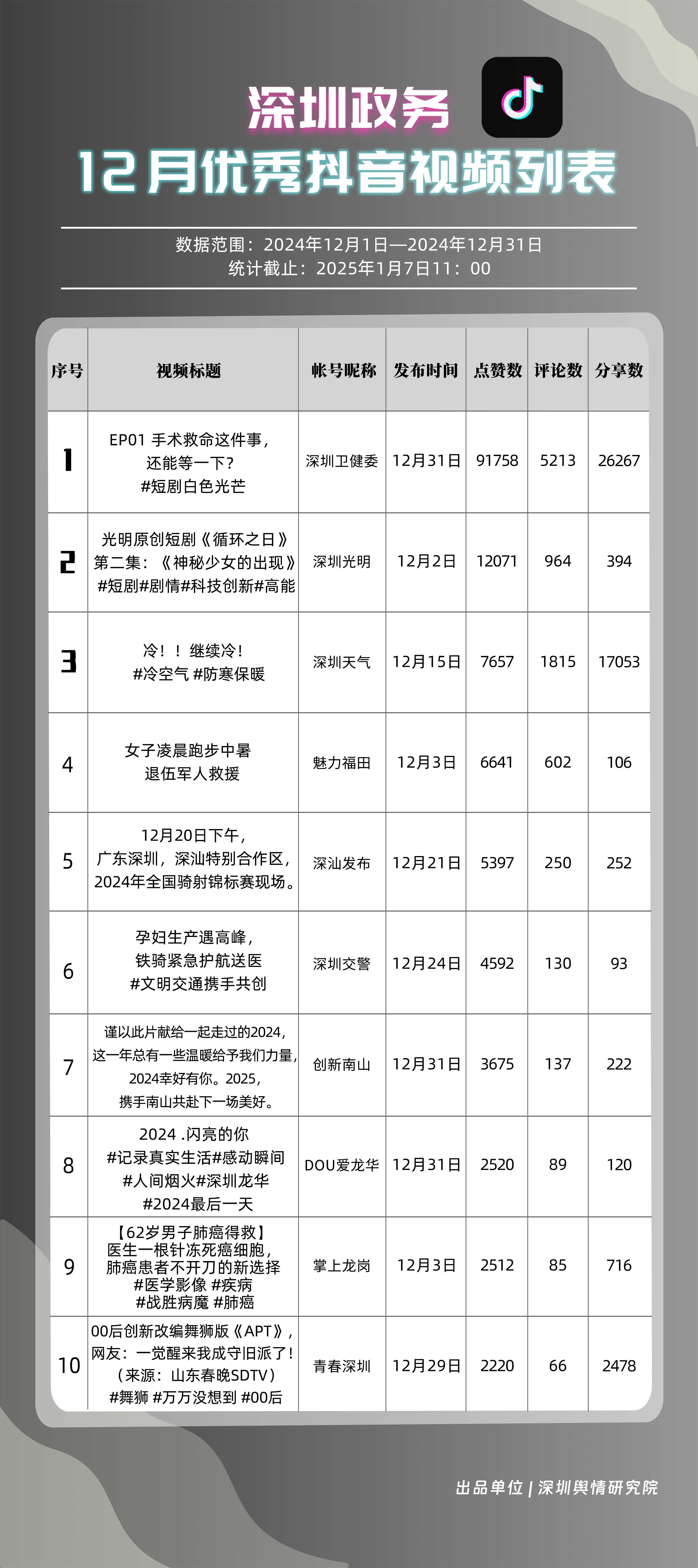 12月,“深圳衛(wèi)健委”“深圳天氣”“深汕發(fā)布”“掌上龍崗”“深圳光明”“DOU愛(ài)龍華”“魅力福田”“青春深圳”“深圳交警”“深圳工會(huì)”共10個(gè)政務(wù)抖音號(hào)獲得“深圳優(yōu)秀政務(wù)抖音號(hào)”稱號(hào)?!吧钲谛l(wèi)健委”在互動(dòng)、傳播方面成績(jī)優(yōu)異,助推其位于榜單首位?!吧钲谔鞖狻薄吧钌前l(fā)布”“掌上龍崗”則各有所長(zhǎng),綜合排名位于榜單前列,內(nèi)容產(chǎn)出豐富、用戶互動(dòng)高頻,信息傳播廣泛,共同展現(xiàn)了政務(wù)抖音號(hào)在服務(wù)公眾、提升信息傳播效能方面的顯著效能。