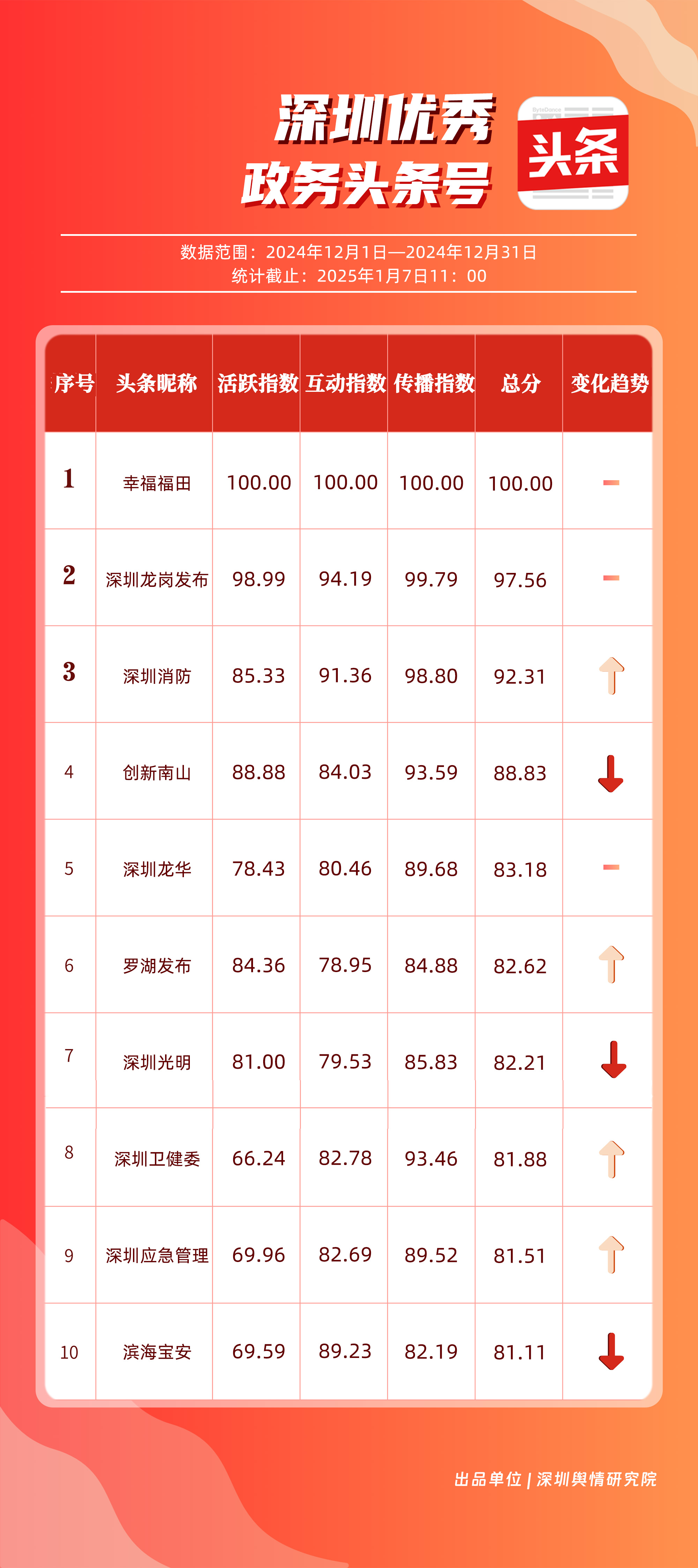 12月,“幸福福田”“深圳龍崗發(fā)布”“深圳消防”“創(chuàng)新南山”“深圳龍華”“羅湖發(fā)布”“深圳光明”“深圳衛(wèi)健委”“深圳應(yīng)急管理”“濱海寶安”共10個(gè)政務(wù)頭條號(hào)入選“優(yōu)秀政務(wù)頭條號(hào)”榜單。對(duì)比其他賬號(hào),“幸福福田”在各方面均取得較好成績(jī),居于榜單第一位置?!吧钲邶垗彴l(fā)布”以97.56分位于榜單第二名,其傳播指數(shù)得分為99.79分,反映出賬號(hào)在信息傳播范圍方面存在明顯優(yōu)勢(shì)。此外,賬號(hào)“深圳消防”“創(chuàng)新南山”“深圳龍華”也為市民提供便捷、高效的政務(wù)信息,位于榜單前五名。