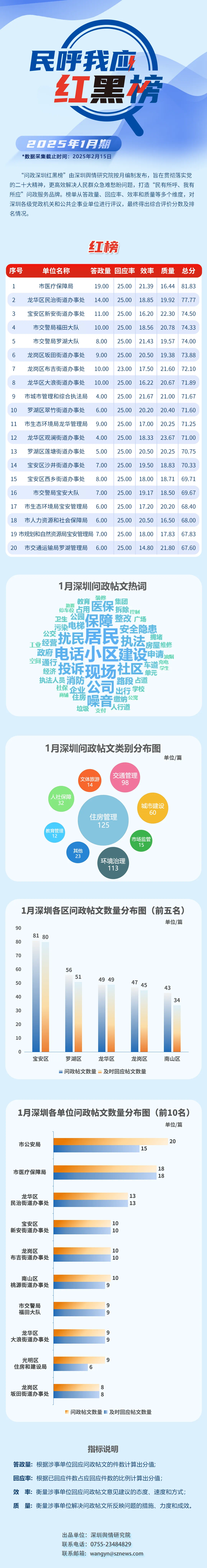 本期榜單采集的帖文主要來自深圳市及各區(qū)政府官網(wǎng)、深圳論壇、人民網(wǎng)領(lǐng)導(dǎo)留言板、深圳新聞網(wǎng)“民呼我應(yīng)”等平臺(tái),所采集帖文發(fā)布時(shí)間為2025年1月1日至1月31日,采集截止時(shí)間為2025年2月15日。