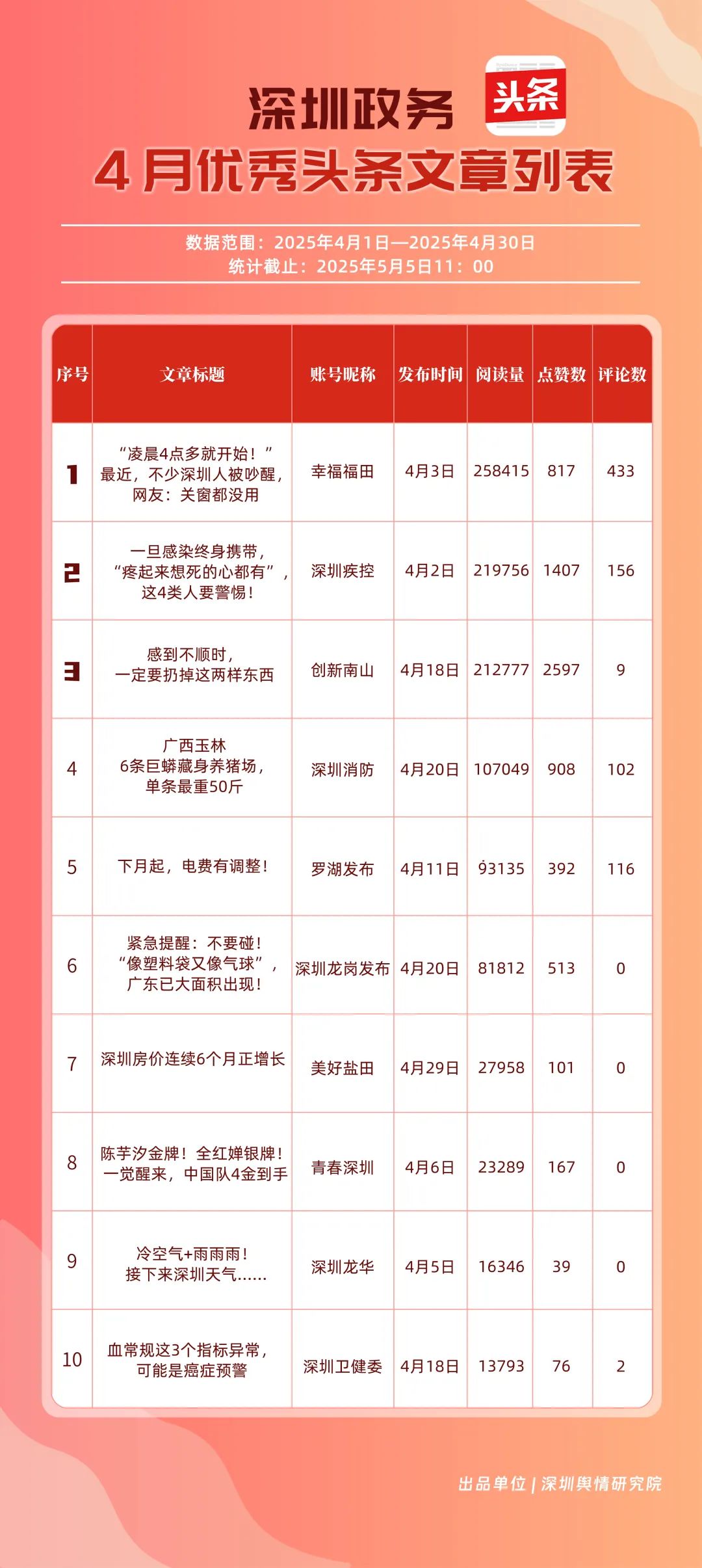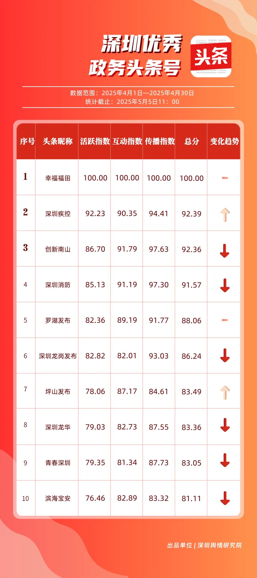 4月,“幸福福田”“深圳疾控”“創(chuàng)新南山”“深圳消防”“羅湖發(fā)布”“深圳龍崗發(fā)布”“坪山發(fā)布”“深圳龍華”“青春深圳”“濱海寶安”共10個政務(wù)頭條號入選“優(yōu)秀政務(wù)頭條號”榜單?!靶腋8L铩毖永m(xù)上月的優(yōu)異表現(xiàn),以優(yōu)質(zhì)的內(nèi)容輸出和穩(wěn)定的用戶互動,位列榜單首位,成為政務(wù)頭條號的標(biāo)桿;“深圳疾控”則以92.39分的亮眼成績排在榜單第二位,凸顯了政務(wù)新媒體在公共衛(wèi)生領(lǐng)域的傳播成果;“創(chuàng)新南山”“深圳消防”“羅湖發(fā)布”緊隨其后,分別在城區(qū)形象宣傳、消防安全領(lǐng)域等方面深耕細作,持續(xù)擴大政務(wù)信息的覆蓋面與影響力。