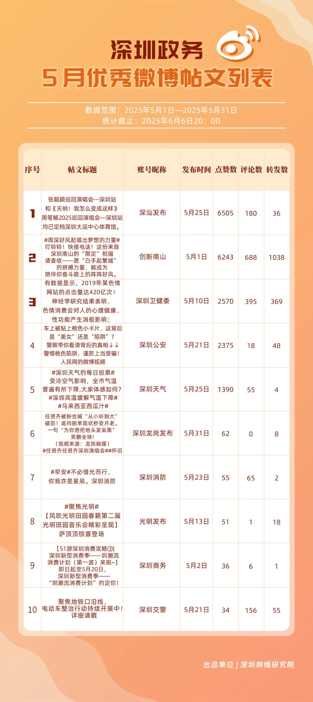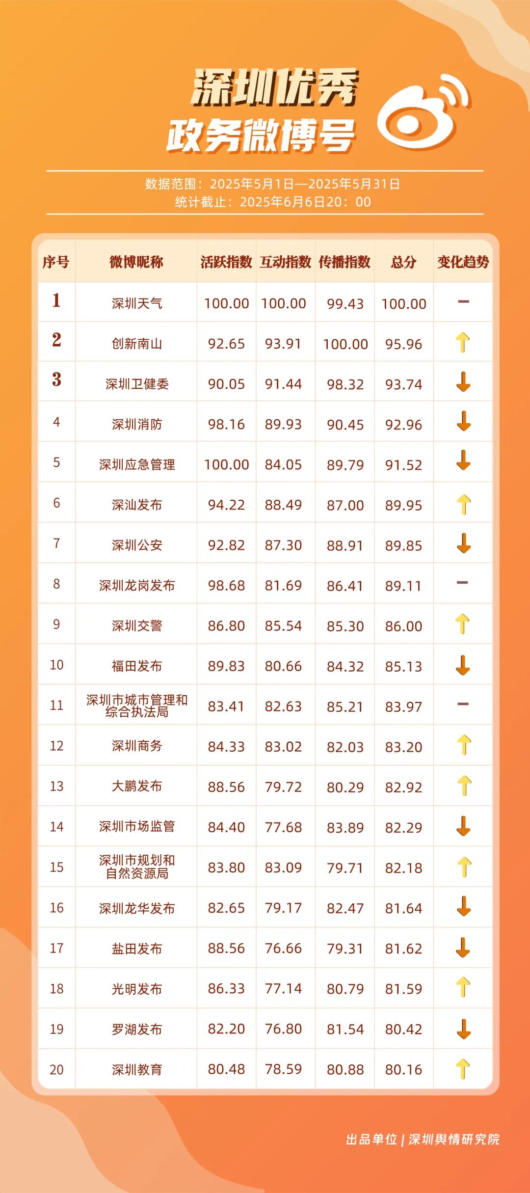 5月,“深圳天氣”“創(chuàng)新南山”“深圳衛(wèi)健委”“深圳消防”“深圳應(yīng)急管理”“深汕發(fā)布”“深圳公安”“深圳龍崗發(fā)布”“深圳交警”“福田發(fā)布”等20個(gè)賬號(hào)入選“優(yōu)秀政務(wù)微博號(hào)”。其中,“深圳天氣”憑借活躍指數(shù)和互動(dòng)指數(shù)雙項(xiàng)滿分的亮眼成績,穩(wěn)居榜單首位?!皠?chuàng)新南山”以95.96分緊隨其后,在互動(dòng)、傳播指數(shù)得分大幅提升,排名實(shí)現(xiàn)顯著躍升?!吧钲谛l(wèi)健委”“深圳消防”“深圳應(yīng)急管理”也表現(xiàn)卓越,總分均超過90分,它們憑借權(quán)威信息發(fā)布、專業(yè)知識(shí)科普,展現(xiàn)了各單位在民生服務(wù)、公共安全領(lǐng)域的重要作用。以上優(yōu)秀政務(wù)微博號(hào)深度契合平臺(tái)的傳播特征,善于借助熱門話題擴(kuò)大影響力,以鮮明的賬號(hào)特色展現(xiàn)區(qū)域風(fēng)采。