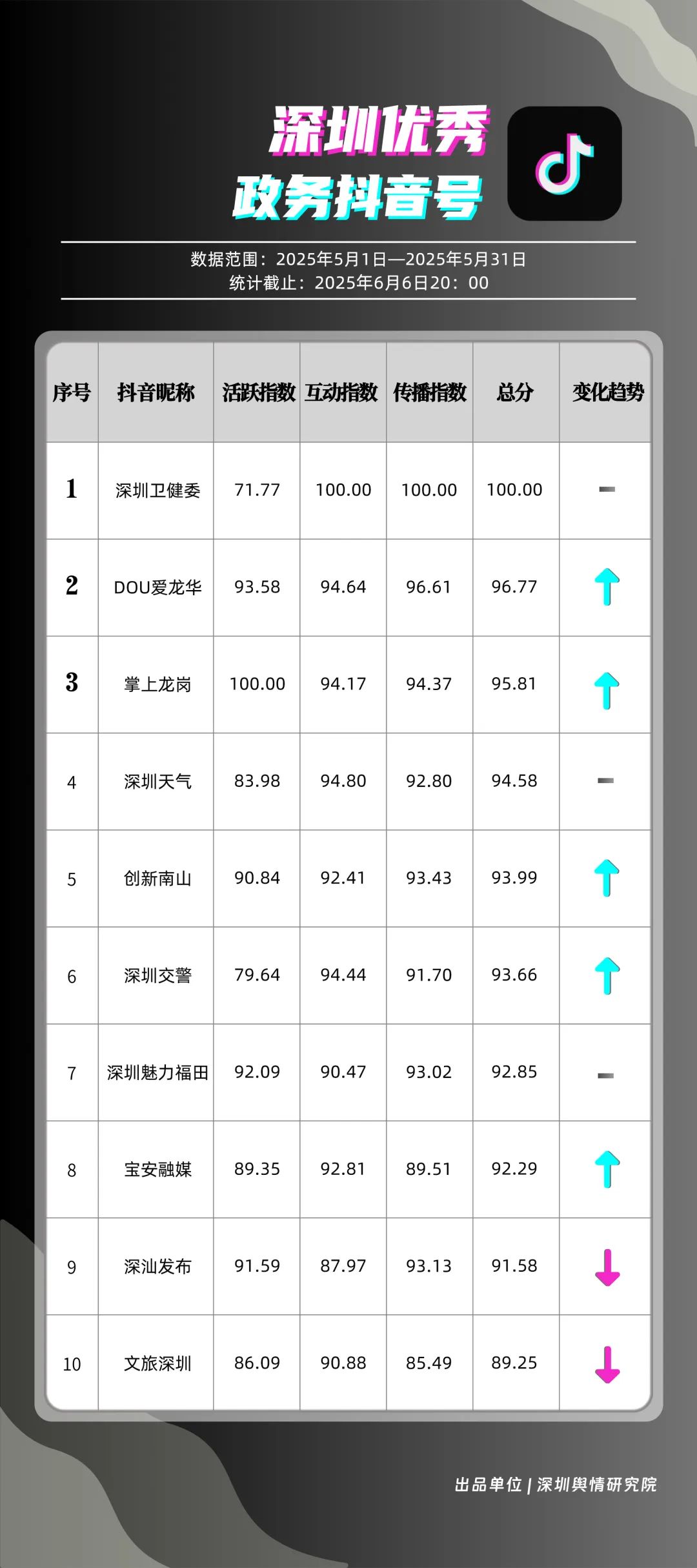 5月,“深圳衛(wèi)健委”“DOU愛龍華”“掌上龍崗”“深圳天氣”“創(chuàng)新南山”“深圳交警”“深圳魅力福田”“寶安融媒”“深汕發(fā)布”“文旅深圳”共10個(gè)政務(wù)抖音號(hào)獲得“優(yōu)秀政務(wù)抖音號(hào)”稱號(hào)。5月,“深圳衛(wèi)健委”憑借3條極具創(chuàng)意的視頻內(nèi)容持續(xù)收獲網(wǎng)民關(guān)注,穩(wěn)居榜首之位,成為政務(wù)抖音號(hào)領(lǐng)域的標(biāo)桿。“DOU愛龍華”“掌上龍崗”較上個(gè)月排名大幅度上升,以96.77分和95.81分位居榜單第2、3名,彰顯出積極探索創(chuàng)新傳播路徑、開拓政務(wù)短視頻發(fā)展新可能的決心。以上優(yōu)秀政務(wù)抖音號(hào)通過多樣化的短視頻形式傳遞政務(wù)資訊,為深圳政務(wù)新媒體在短視頻領(lǐng)域的蓬勃發(fā)展注入強(qiáng)勁動(dòng)能,成為政務(wù)信息傳播的新標(biāo)桿。