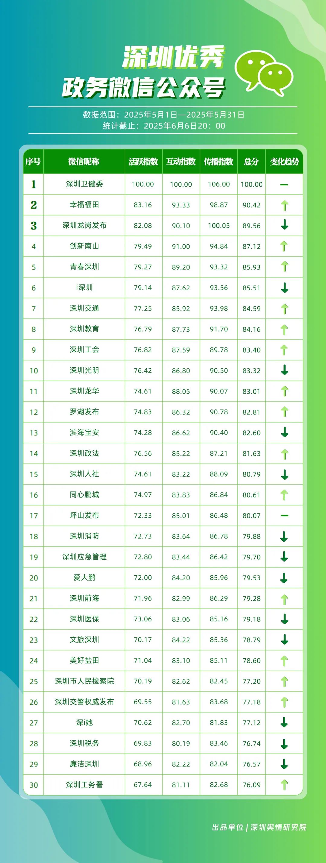 5月,30個(gè)政務(wù)微信公眾號(hào)入選“深圳優(yōu)秀政務(wù)微信公眾號(hào)”榜單,其中包括“深圳衛(wèi)健委”“幸福福田”“深圳龍崗發(fā)布”“創(chuàng)新南山”“青春深圳”“i深圳”“深圳交通”“深圳教育”“深圳工會(huì)”“深圳光明”等。其中,“深圳衛(wèi)健委”在活躍、互動(dòng)、傳播3項(xiàng)指標(biāo)上獲得滿分,其亮眼數(shù)據(jù)彰顯了內(nèi)容創(chuàng)作的高質(zhì)量,位居榜單首位?!靶腋8L铩蓖瑯颖憩F(xiàn)出色,排名較上個(gè)月有所上升,以總分90.42的優(yōu)異成績位居榜單第2名;“深圳龍崗發(fā)布”“創(chuàng)新南山”“青春深圳”緊隨其后,以新穎的互動(dòng)形式吸引用戶參與,表現(xiàn)值得肯定。上榜賬號(hào)充分發(fā)揮微信公眾平臺(tái)的傳播優(yōu)勢(shì),以豐富多元的內(nèi)容形態(tài)、生動(dòng)鮮活的表達(dá)風(fēng)格,持續(xù)為市民提供優(yōu)質(zhì)的信息服務(wù)。