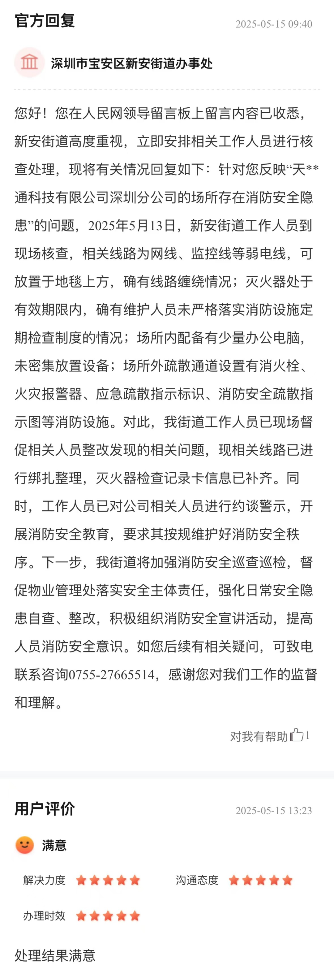 企業(yè)電氣線路混亂、滅火器維護(hù)缺位等消防隱患,直接威脅員工生命財(cái)產(chǎn)安全,更潛藏重大事故風(fēng)險(xiǎn)。街道辦收到市民反饋后,迅速核查并高效解決現(xiàn)存問(wèn)題,以“即知即改”的行動(dòng)力回應(yīng)群眾關(guān)切。后續(xù)通過(guò)約談警示、安全宣教等舉措,從“治已病”轉(zhuǎn)向“防未病”,切實(shí)筑牢區(qū)域消防安全屏障,展現(xiàn)基層對(duì)安全隱患的快速治理能力,傳遞出“民生安全無(wú)小事”的責(zé)任擔(dān)當(dāng),獲得網(wǎng)民的五星好評(píng)。