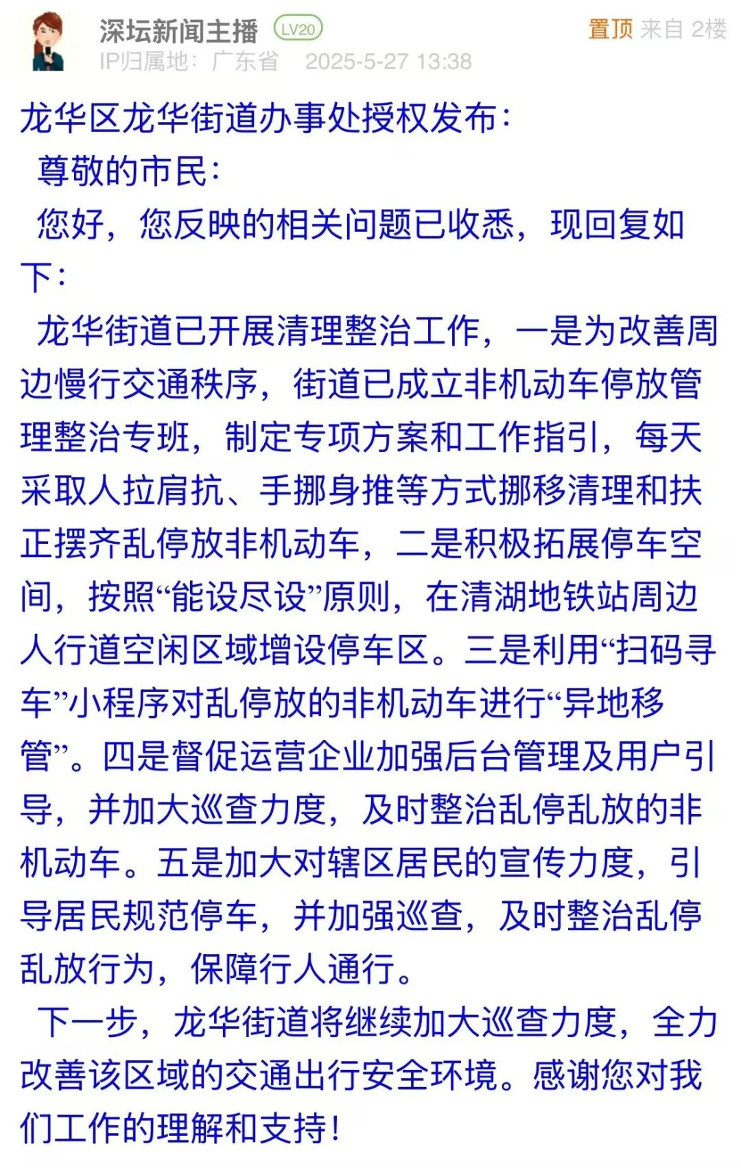 案例點(diǎn)評(píng):地鐵口電動(dòng)車(chē)與共享單車(chē)堆積,既阻礙行人通行,更影響區(qū)域交通秩序與城市形象。龍華街道辦接訴后迅速響應(yīng),成立專項(xiàng)整治專班,通過(guò)每日清理扶正、增設(shè)停車(chē)區(qū)、“掃碼尋車(chē)”移管、督促企業(yè)巡查及居民宣傳引導(dǎo)等多維度舉措,破解亂停難題,以“疏堵結(jié)合”的治理智慧,快速行動(dòng),綜合施策,為改善區(qū)域交通環(huán)境提供了務(wù)實(shí)范本。