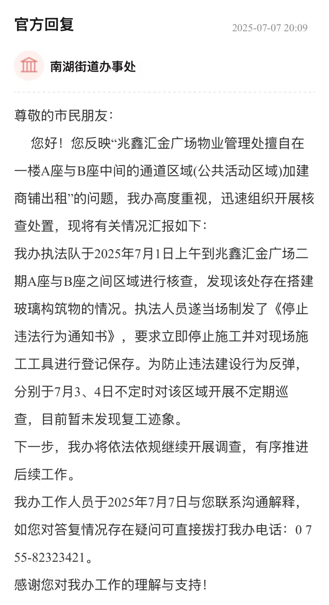 從市民反饋到執(zhí)法處置,羅湖區(qū)南湖街道辦事處以快速響應(yīng)、精準執(zhí)法展現(xiàn)治理效能。通過現(xiàn)場核查、制發(fā)《停止違法行為通知書》、登記保存施工工具等措施,及時遏制違法搭建勢頭,并建立不定期巡查機制防止反彈。從“即時制止”到“長效監(jiān)督”的閉環(huán)管理,維護了業(yè)主合法權(quán)益與消防通道安全,為城市違建治理提供了高效務(wù)實的實踐樣本,彰顯基層執(zhí)法部門守護民生安全的責(zé)任擔(dān)當(dāng)。