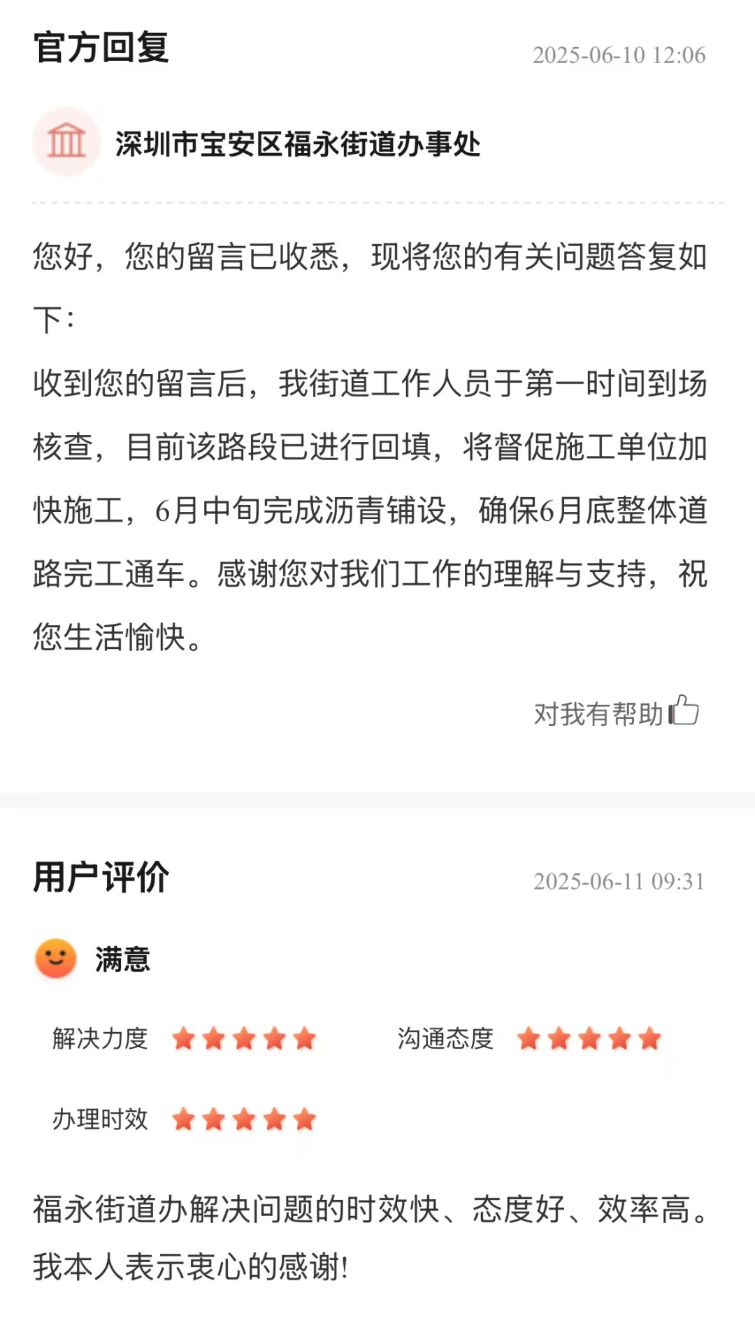 案例點評:道路銜接處的大坑大坎影響通行安全與道路順暢,亟待解決。街道辦收到留言后迅速行動,第一時間到場核查,明確將督促施工單位加快進度,在預(yù)計時間內(nèi)完成瀝青鋪設(shè)及道路整體完工,這些舉措體現(xiàn)了對道路通行問題的重視和高效的處理能力,為保障道路正常通行提供了有力保障,獲得了市民的滿意評價。