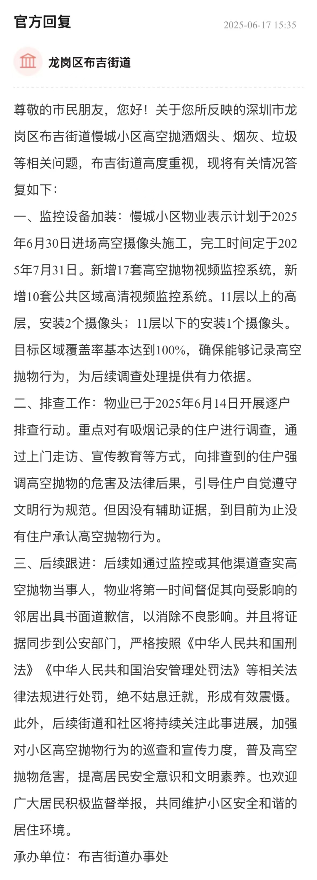 高空拋物嚴重威脅居民人身與財產(chǎn)安全,需嚴肅對待。街道辦接到相關(guān)反映后,積極推動物業(yè)規(guī)劃加裝視頻監(jiān)控系統(tǒng),明確了施工和完工時間,同時安排物業(yè)開展逐戶排查,重點調(diào)查有吸煙記錄住戶,體現(xiàn)出對問題的重視和解決問題的行動力。在后續(xù)保障方面,明確查實拋物當(dāng)事人后將督促其道歉并交由公安部門依規(guī)處罰,街道和社區(qū)也將持續(xù)關(guān)注、加強巡查與宣傳,為維護小區(qū)安全提供了有力支持。