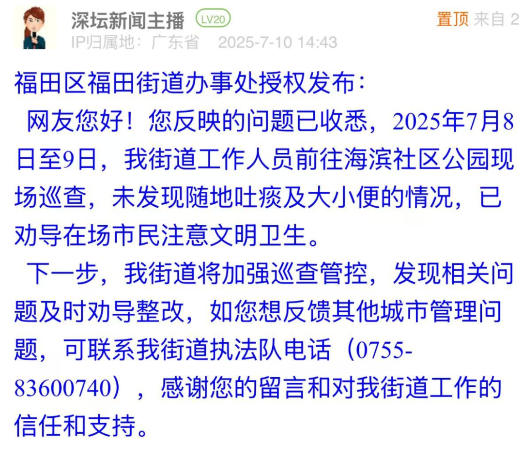 案例點評:對于市民反映的路面油污問題,布吉街道辦立即安排環(huán)衛(wèi)部門進行清洗,并于第二日在問政帖文下進行回復,以現(xiàn)場圖片展示路面清理效果,表示將加強后續(xù)巡查。此次處置展現(xiàn)了基層部門高效務實的問題處理能力,為城市道路環(huán)境管理提供了快速響應與長效維護相結(jié)合的實踐范例,切實回應了市民對潔凈環(huán)境的期待。