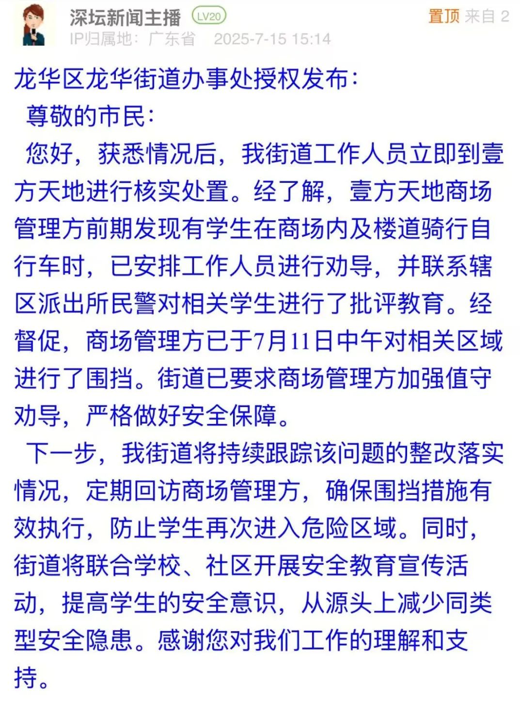 2、有市民反映龍華區(qū)壹方天地內(nèi)有學生危險騎行,質(zhì)疑商場安全監(jiān)管不足