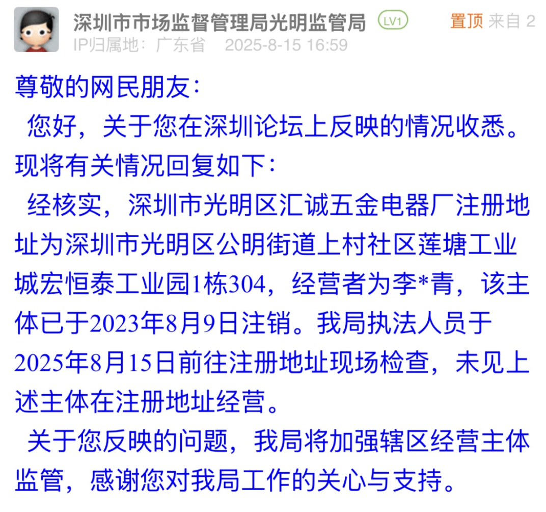 優(yōu)化建議:深圳市市場監(jiān)督管理局光明管理局的回應(yīng)中,核實了涉事電器廠已注銷,且不在注冊地經(jīng)營,也提及加強轄區(qū)主體監(jiān)管,但市民反映的排插套用注銷主體信息銷售、違規(guī)標識3C標志等關(guān)鍵問題,未得到明確解答。若回應(yīng)中能豐富指引類內(nèi)容,如告知市民可向平臺追責(zé)的途徑、提交證據(jù)的具體方式,為市民維權(quán)提供清晰方向,將更貼合市民需求,也能讓回應(yīng)更具實際意義。
